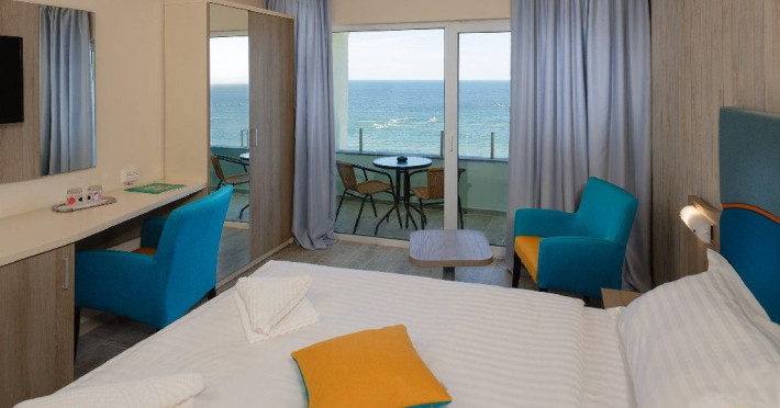 Apartamente Master Suite- vedere frontala la mare, format din camera dubla cu pat matrimonial 180 cm/200 cm, living cu canapea extensibila 140 cm/ 200 cm, chicineta dotata cu frigider, plita electrica, cuptor microunde. Cele doua incaperi - camera dubla si living-ul sunt separate de usa. Baia este dotat cu cada. Este situata la etajul 14 al hotelului.
