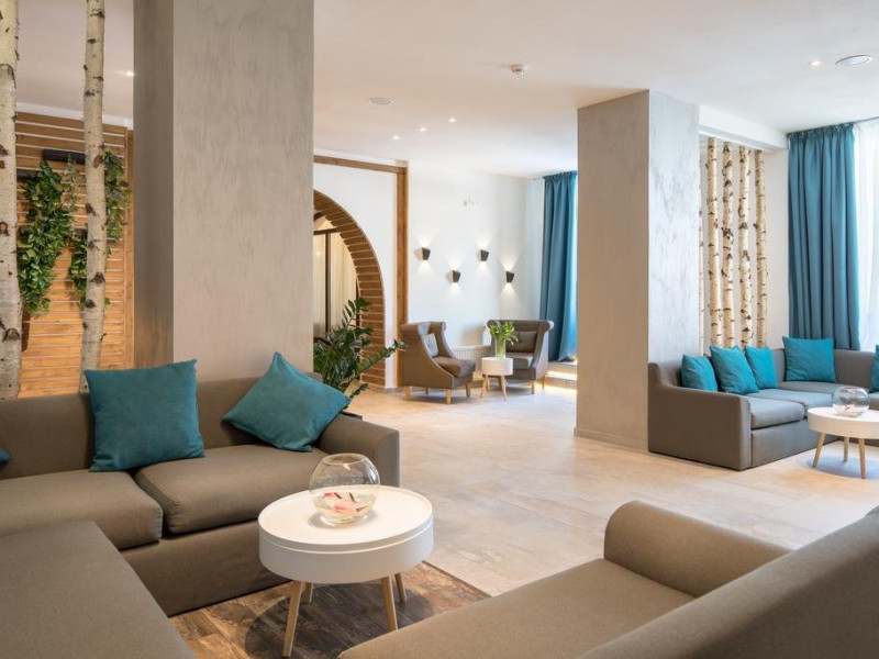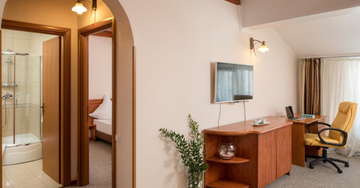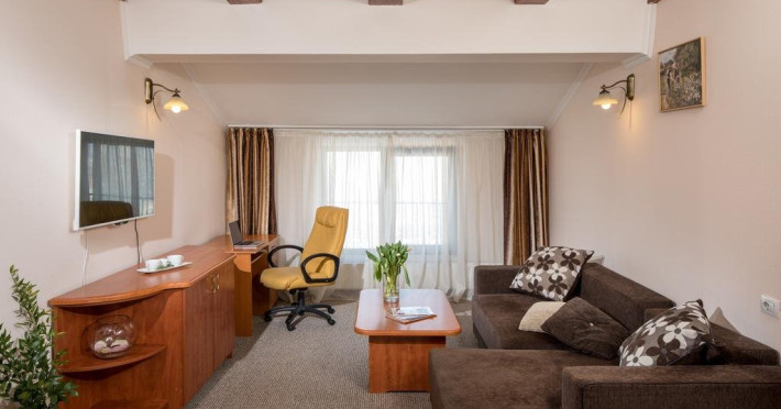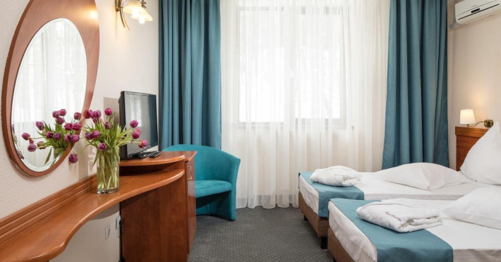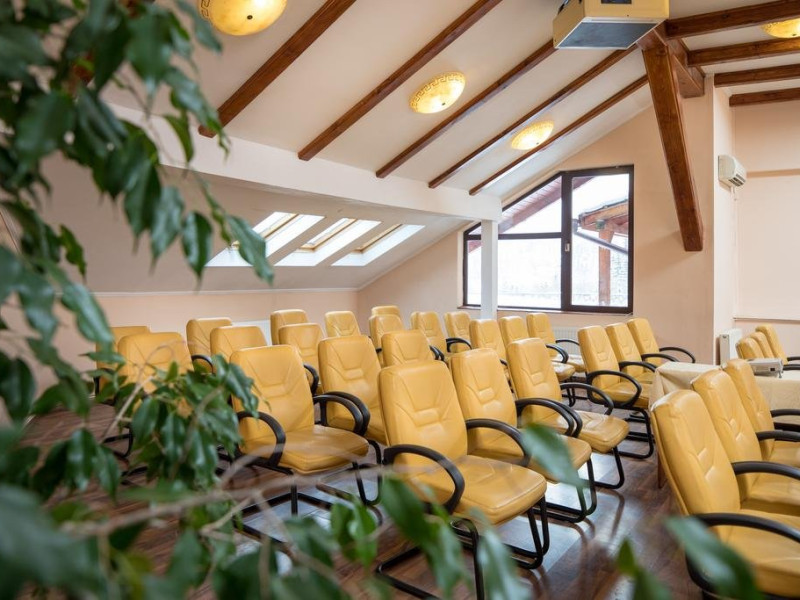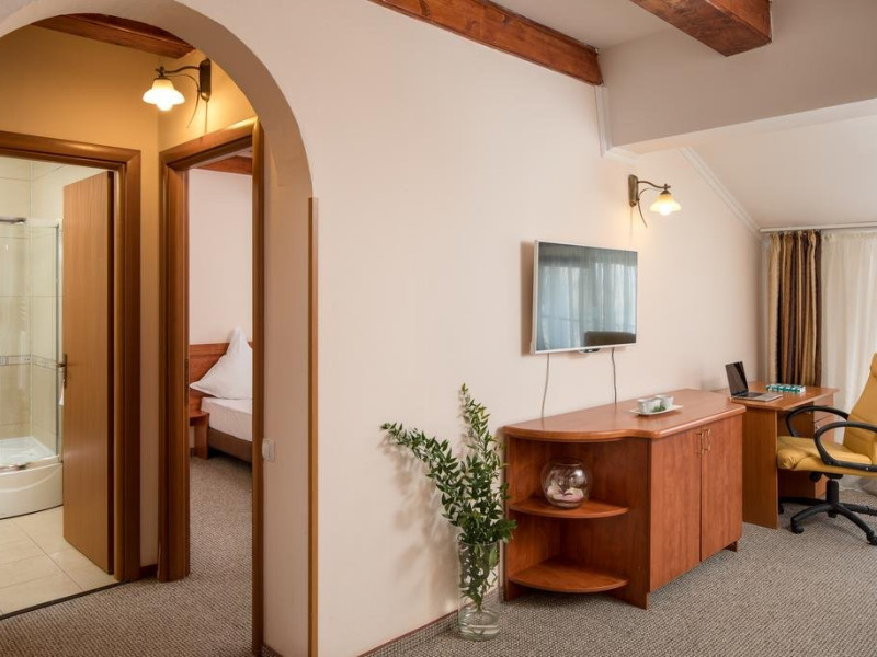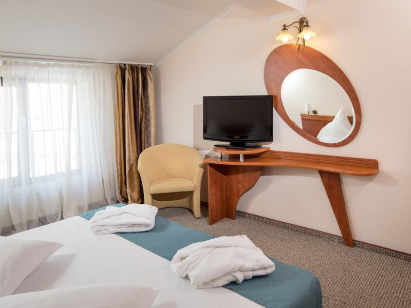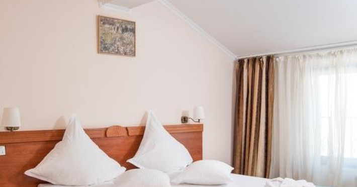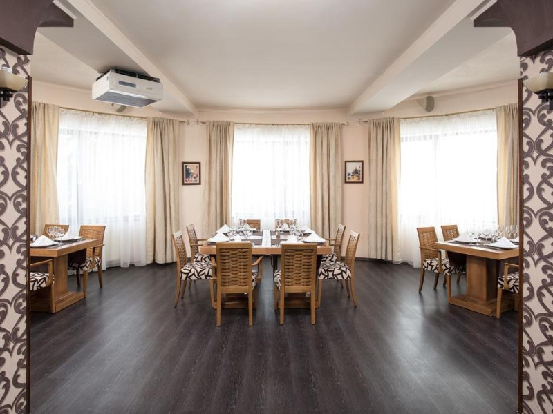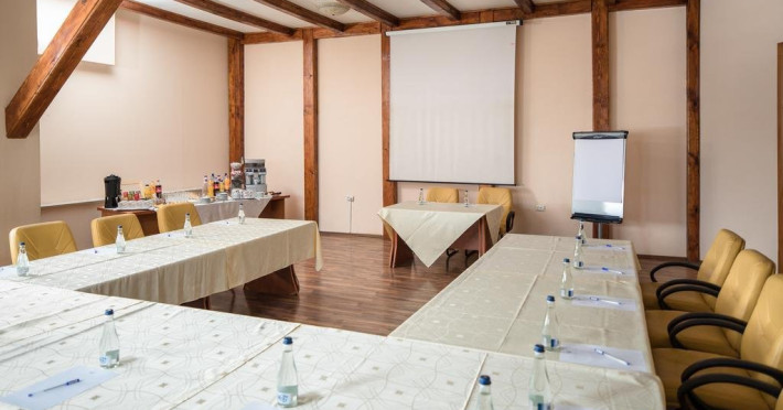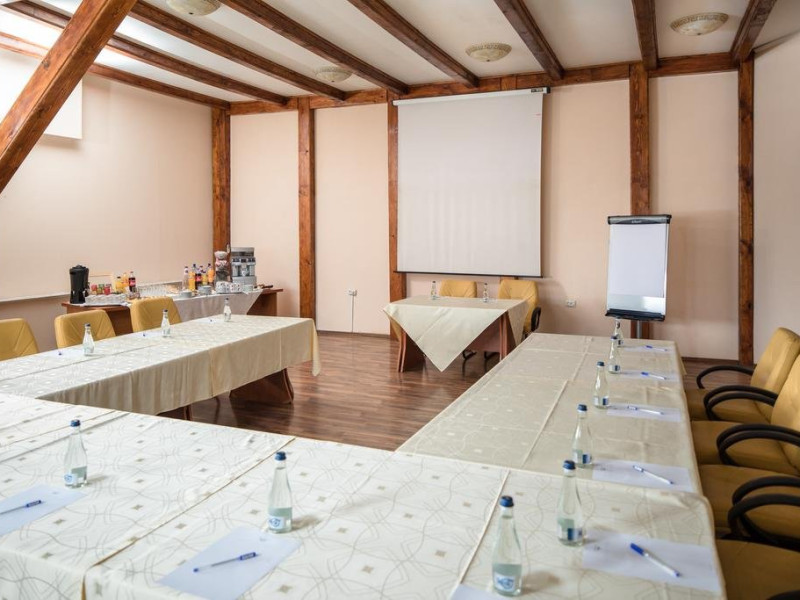 Facilitati hotel :Hotelul dispune de 64 de camere duble (matrimoniale sau cu 2 paturi) si 6 apartamente, restaurant cu capacitate de 300 locuri, centrul de conferinta, Centru SPA (cu aparate fitness de ultima generatie, sauna, jacuzzi, solar si masaj), Disco Club, parcare.