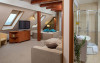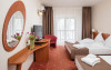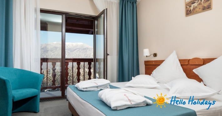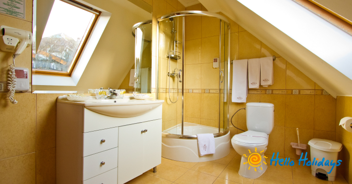 Camera dubla superior: este formata dintr-un pat dublu matrimonial queen size si o canapea extensibila, fiind potrivita pentru o familie cu doi copii. De asemena, in componenat intra si o baie proprie dotata cu dus, uscator de par si articole de baie.