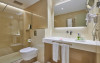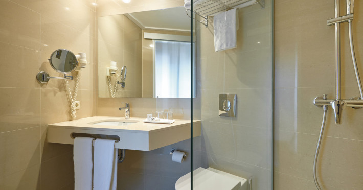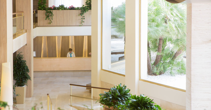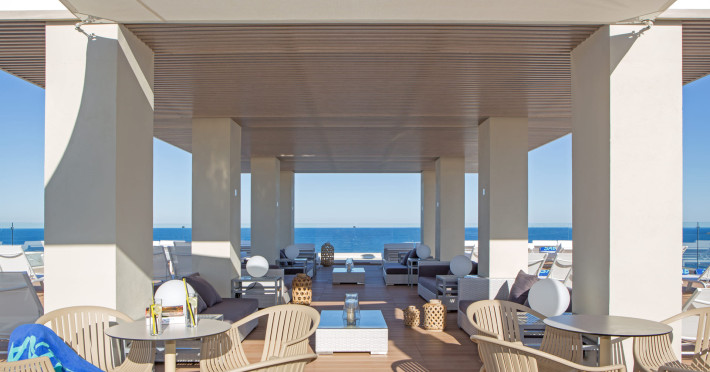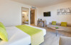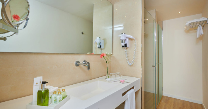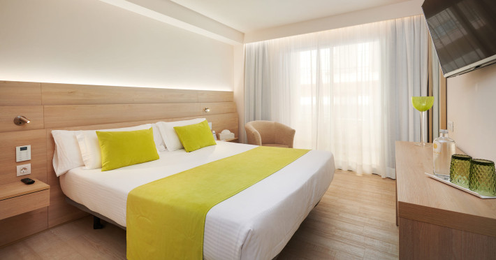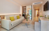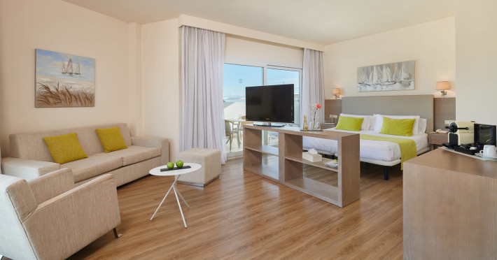 The hotel Sabina & Suites is located next to a public sandy beach. The nearest restaurants and bars can be reached in a few minutes on foot. The old town is only around 200 m away. Shops are right on your doorstep, a supermarket is around 200 m away. There is a 24h shuttle service between the hotel and the airport (for a fee) 24h a day. The beach is patrolled by a lifeguard. Here, there are cushions, sun umbrellas and beach towels available. Near the beach there is a promenade where you can go for a stroll. The air-conditioned hotel has a 24h reception (check-in is possible around the clock), a lobby, Wi-Fi, internet access, 3 lifts, a jacuzzi, showers and changing rooms, a first aid kit as well as a TV lounge with satellite TV. In the outdoor area you will find a supervised pool (open all year), where sun loungers, sun umbrellas and pool towels are available for free. For children there is also a separate children's pool. Furthermore, outside you can find a roof terrace. Inside the hotel you can use a heated indoor pool. You can store your valuables in the safe (extra fee), and your luggage in the hotel`s storage room. In addition, the hotel Sabina & Suites is video-monitored 24h a day. For your entertainment, the hotel offers a library/reading room. For very young guests, kid`s chairs and cots can be provided. For the smallest children prams can be rented in the hotel. There is also a laundry service available at an additional cost to customers as well as an ironing service. Ironing equipment can also be rented at the hotel for a fee. For your comfort there is a concierge service. The energy supply is 230 and 240 Volts. If you want to explore the holiday region, you can use the car and motorbike rental service close to the hotel (extra fee). In your hotel, a lot of focus is placed on sustainability. This includes the hotel`s own recycling bins, the provision of soap, shampoo and lotion dispensers, organic food and ecological meals, a central room air-conditioning and environmentally-friendly cleaning. That is why the hotel Sabina & Suites was also awarded a sustainability certificate. Euro/Master Card, Visa and EC cards are accepted as means of payment. Due to its barrier-free facilities , such as a revolving door in the entrance area, a sliding door in the entrance area, an automatic hotel door, barrier-free entrances, wheelchair accessible rooms, a wheelchair accessible lift and wheelchair-accessible bathrooms, the hotel is also suitable for wheelchair users. Catering As catering services the hotel offers half board, breakfast only and self-catering. Breakfast is offered American, continental or from the buffet. Dinner is also served as a buffet with starters, salads and desserts (extras on request). Half board includes breakfast and lunch. For the meals, there are a buffet restaurant with terrace (gluten-free and vegetarian dishes) and a bar, the cafeteria as well as the pool bar. The drinks menu of the hotel includes water, soft drinks, coffee and tea, beer and wine. For dinner, guests are asked to wear appropriate clothing in the restaurant. Distances