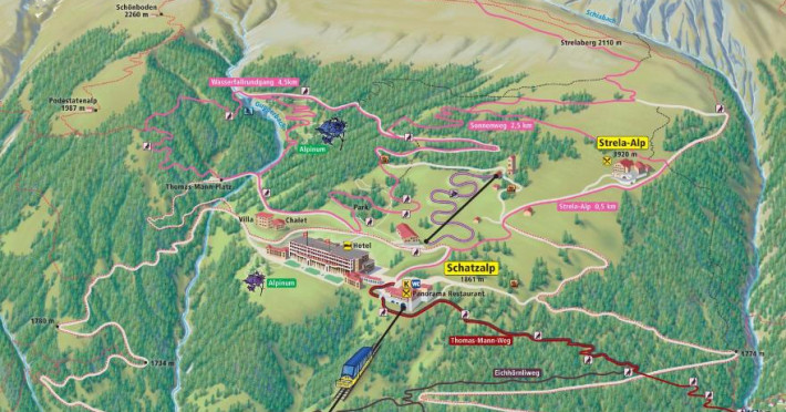 Aflat in mijlocul unei grădini botanice frumoase, cu 3.500 de specii de plante alpine, Schatzalp este binecunoscut si pentru romanul Muntele Vrăjit scris de Thomas Mann.