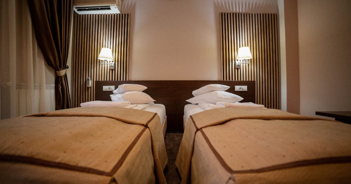 Complexul dispune de o capacitate de 50 locuri impartite in 20 de camere duble si 4 apartamente. Toate aceste camere si apartamente sunt de 4 stele si sunt dotate cu: mobilier deosebit, minibar, televizor, televiziune prin satelit, telefon in camera, cabine de dus, uscator de par, telefon in baie, halat de baie, slapi (papuci de baie), Wi-Fi Gratuit, seif.Camera Family este o camera dubla standard cu o canapea extensibila.