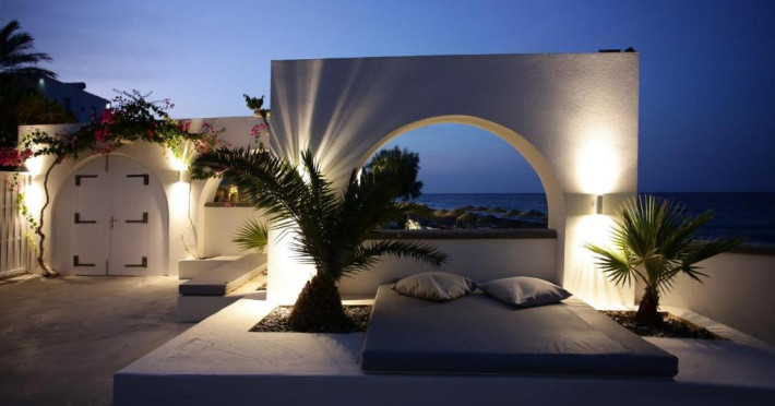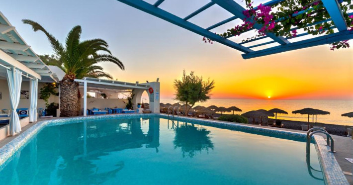 Hotelul Sigalas este o clădire în stilul tipic din Insulele Ciclade, situată pe faimoasa plajă cu nisip negru din Kamari.Localizare