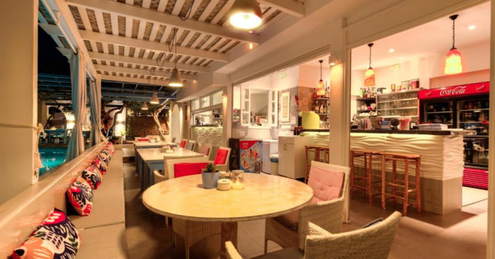 Restaurantul proprietăţii oferă mâncăruri grecești și mediteraneene, fiind deschis între orele 11:00 și 22:00. Barul hotelului servește cafea și băuturi cu sau fără alcool până la ora 23:00.