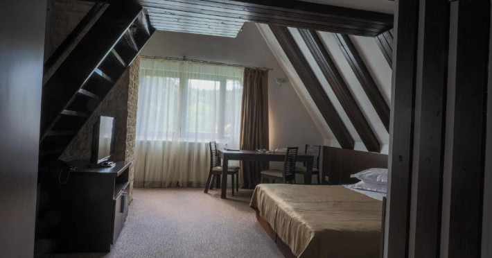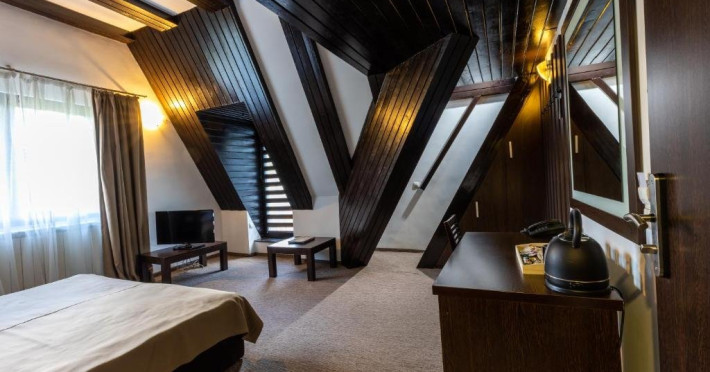 Camera dubla premium, cu o suprafata de 35 mp, pune la dispozitia turistilor pat matrimonial, o canapea si chicineta, baie cu dus, internet, AC, TV, vedere la gradina si munte. Camera poate acomoda pat suplimentar la cerere si poate gazdui 2 adulti si 1 copil de 6 ani.