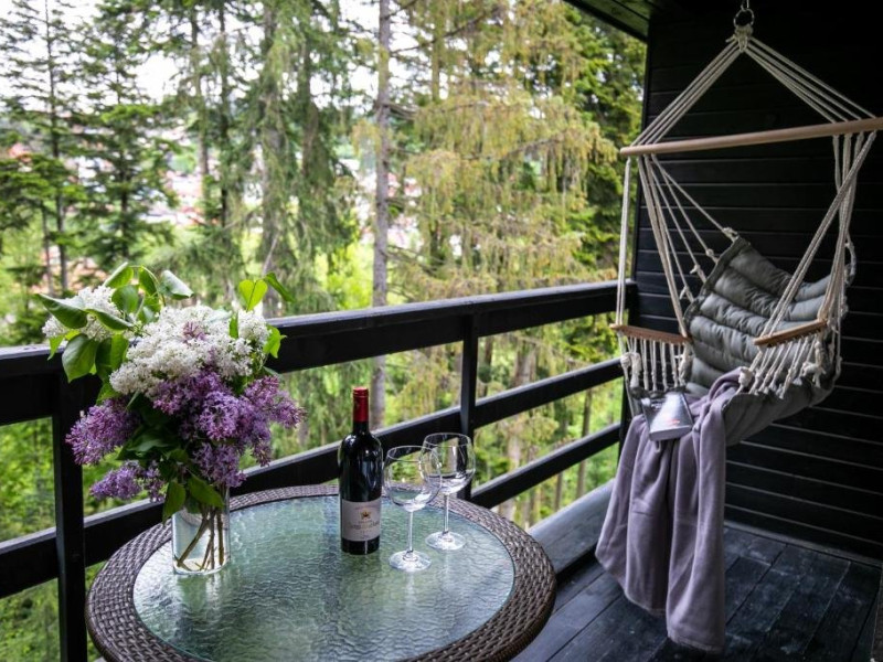 Camera dubla superioara, cu o suprafata de 26 mp, mobilata modern, cu pat matrimoniala si fotoliu extensibil, fiind ideala pt familii, balcon generos cu hamac si cu vedere la munte, baie cu dus,internet TV, AC. Poate acomoda maxim 3 adulti si 1 copil de 6 ani. Nu se poate pune pat suplimentar.