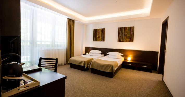 Camera dubla standard - este spatioasa cu 24 mp, mobilata modern, cu 2 paturi twin si un balcon generos cu vedere catre munte. Camera poate gazdui maxim 2 adulti. Punem la dispozitie si optiunea pentru pat suplimentar in camera.