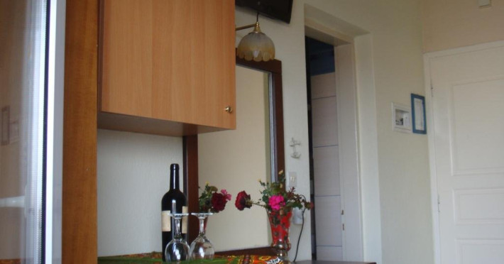 Studio de 2-3 persoane: 2 camere (zona deschisa) cu bucatarie intr-una din zone si pat matrimonial in cealalta.