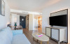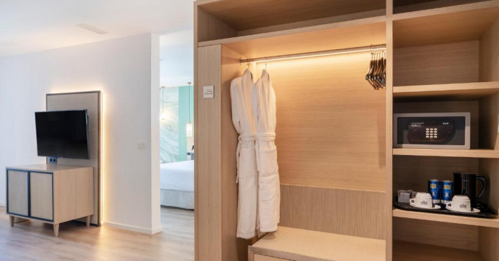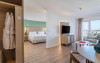 Suitele sale junior sunt elegante și au o terasă mobilată cu vederi superbe asupra portului de agrement sau la mare. Au incălzire sezonieră și aer condiționat (sistem centralizat). Există 2 televizoare inteligente cu intrare USB. Baia modernă este dotată cu articole de toaletă gratuite, duș, chiuvetă dublă, oglindă cosmetică și uscător de păr. Există și o cadă langă pat