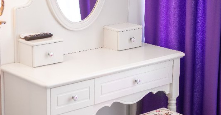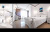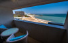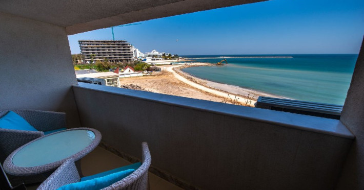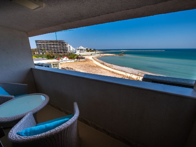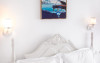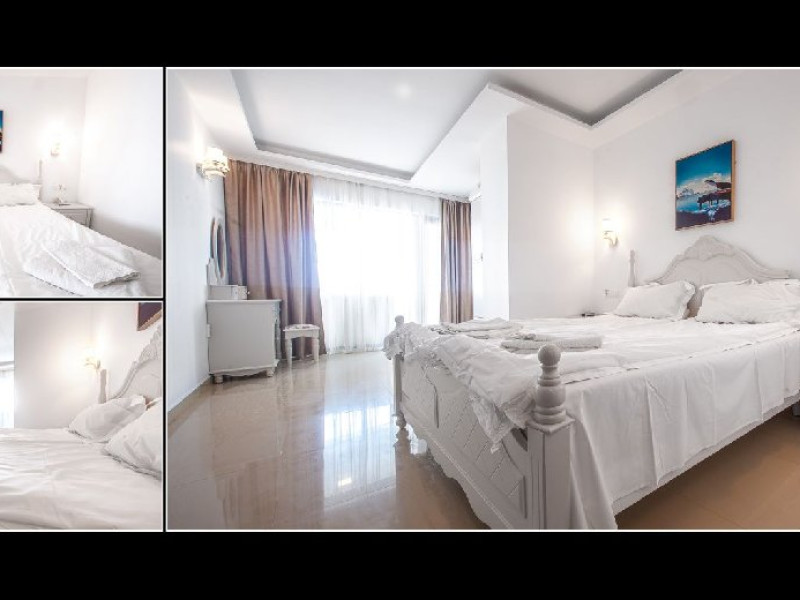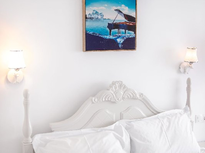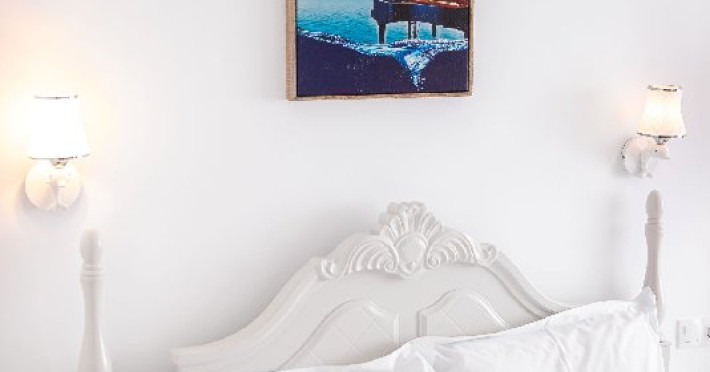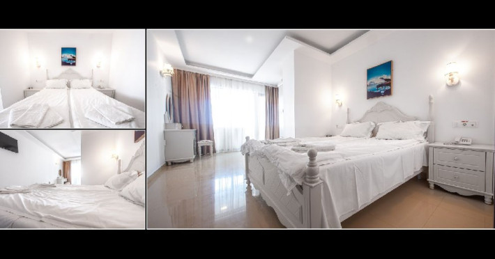 Camera dubla superioara este dotata cu mobilier alb, stil retro, pat matrimonial, masuta cu fotolii si un balcon generos cu vedere la mare. Are o suprafata de aproximativ 24 mp.