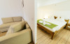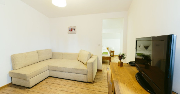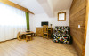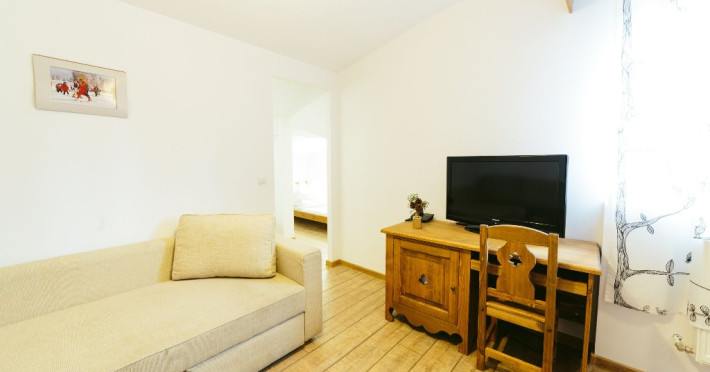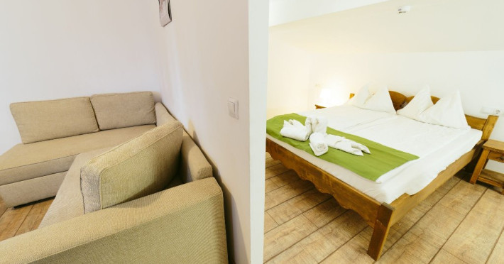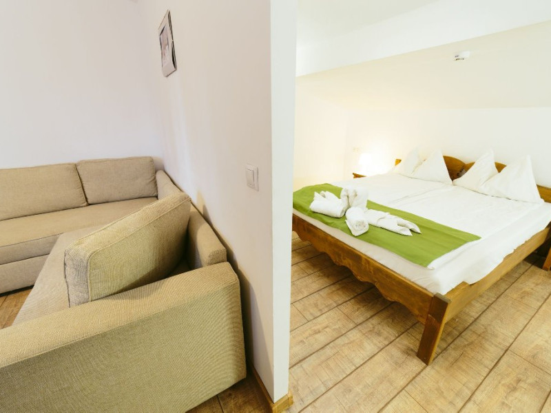 Junior Suite - Suita junior este o camera cu mobilier nou din lemn masiv si parchet. Ele nu beneficiaza de balcon, insa sunt mari si confortabile pentru familii. In suita junior exista un living cu canapea extensibila din care se intra intr-un dormitor (spatiu deschis, fara usa) care are un pat dublu.