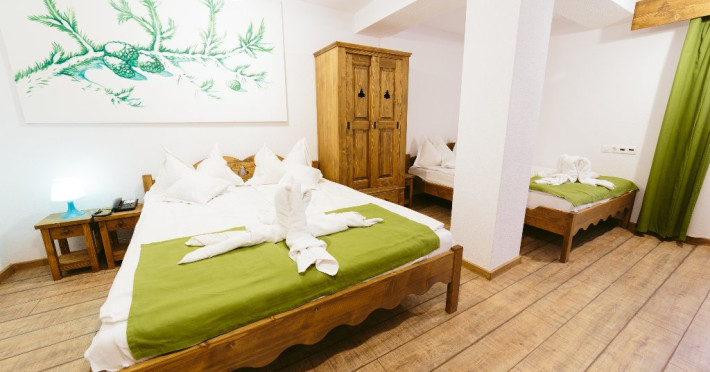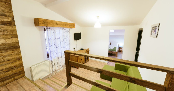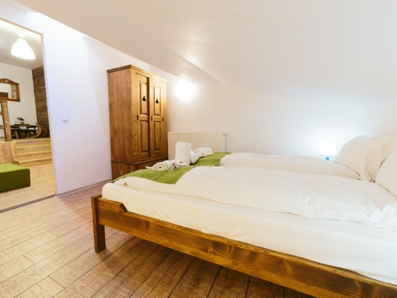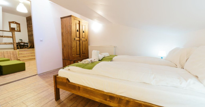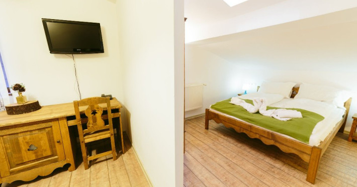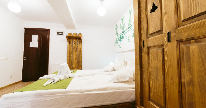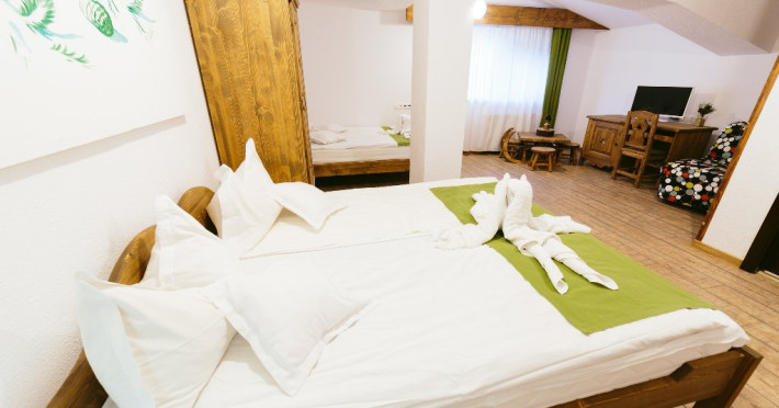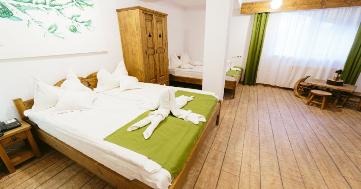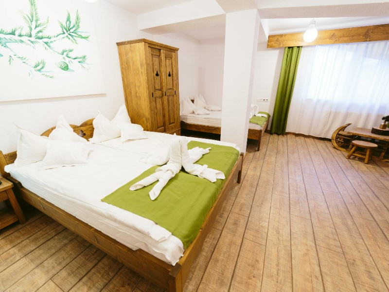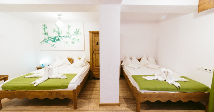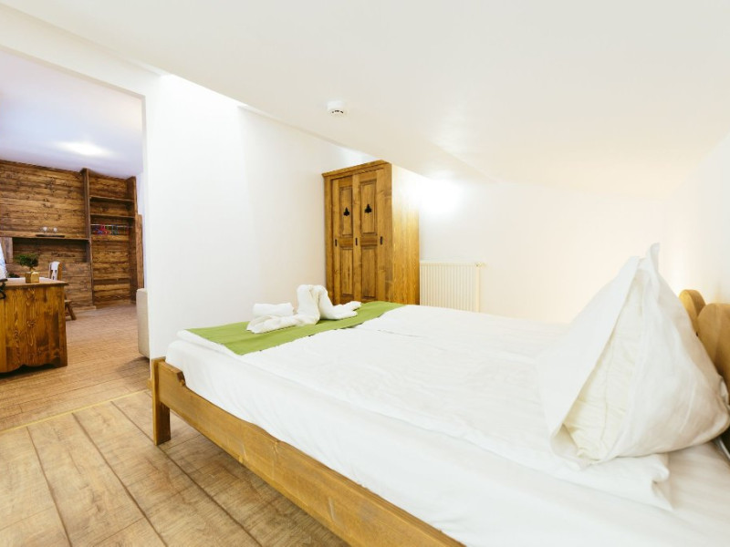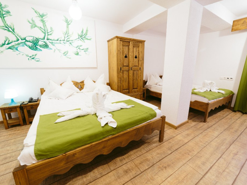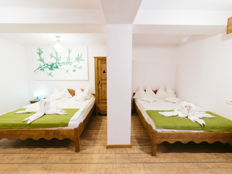 Camera cvadrupla superioara - Camera cvadrupla superioara a fost renovata in anul 2018 cu mobilier nou din lemn masiv si parchet. Ea are 2 paturi duble, vedere panormanica spre munti (fara balcon), camera perfecta pentru familii.