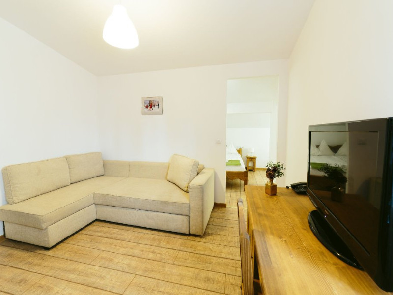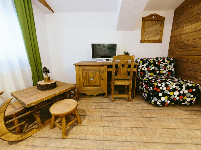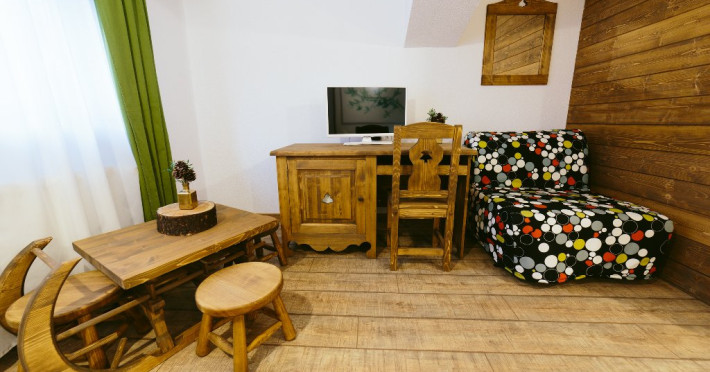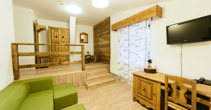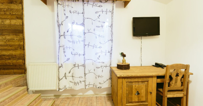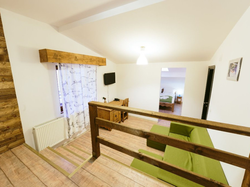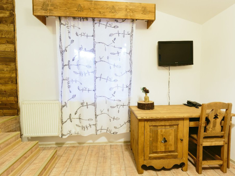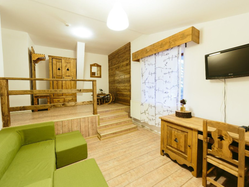 Dotari: televizor LED, dulap, frigider, baie dotata cu cabina de dus si uscator de par, telefon, internet, parchet, mobilier nou din lemn masiv.Suprafata camerei este de aproximativ 30 m.