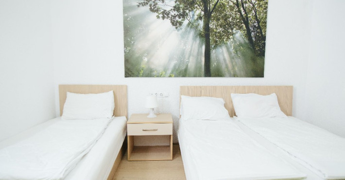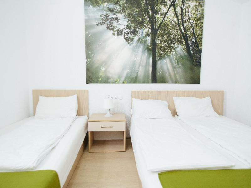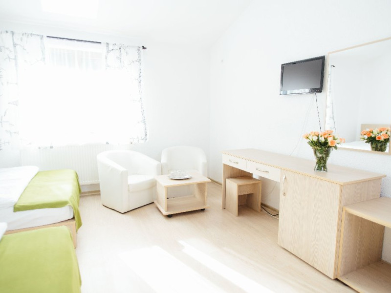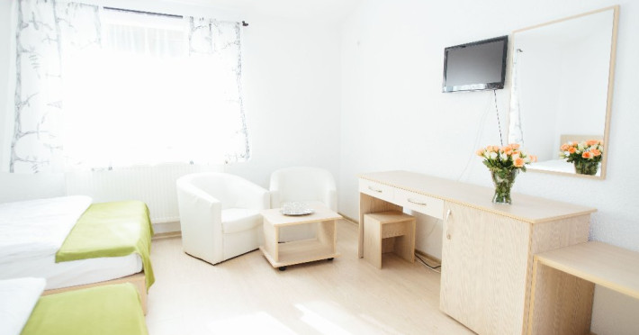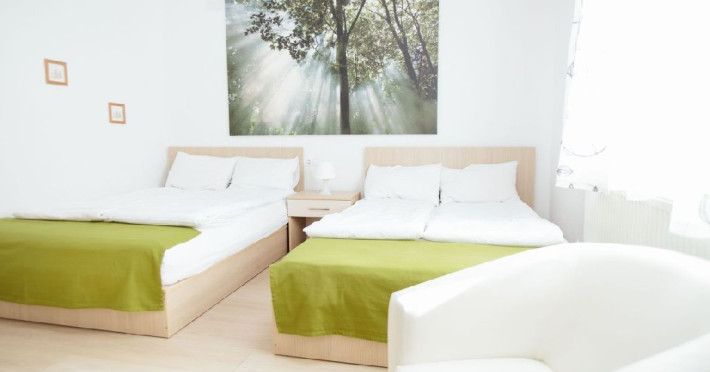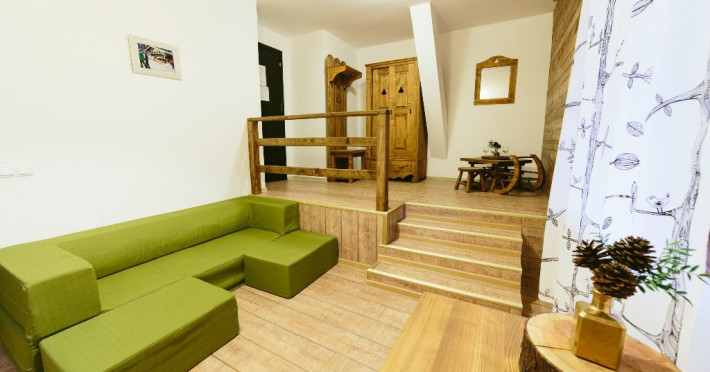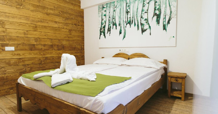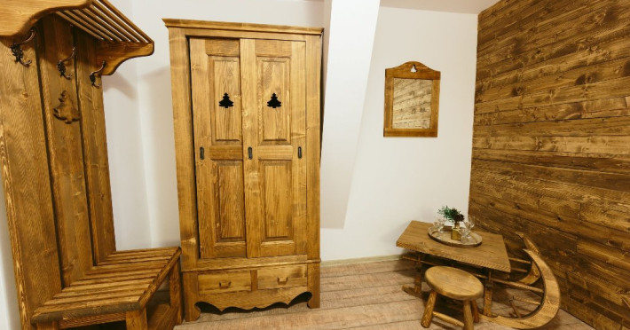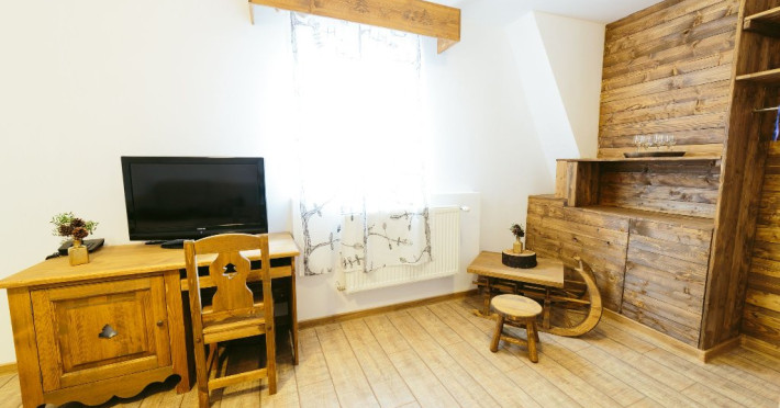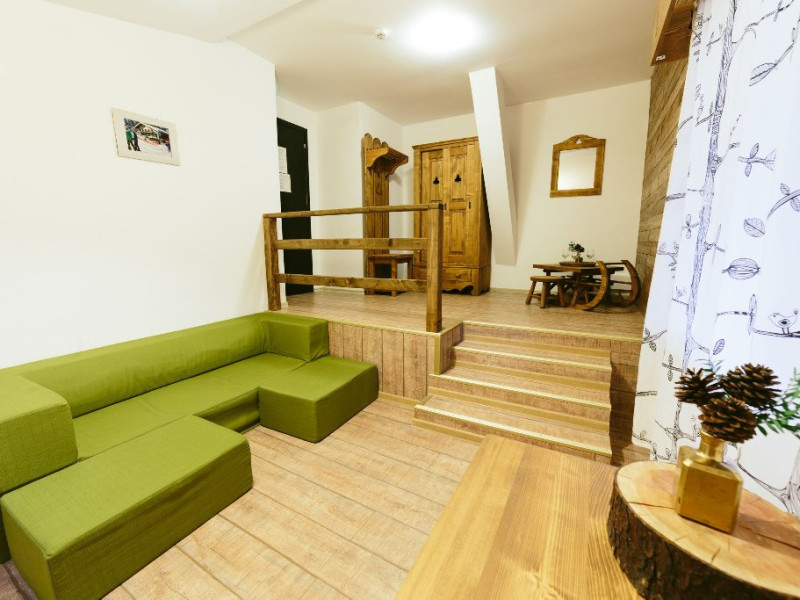 Dotari: televizor LED, dulap, frigider, baie dotata cu cabina de dus si uscator de par, telefon, internet, parchet, mobilier nou din lemn masiv.Suprafata camerei este de aproximativ 30 m.
