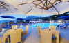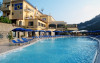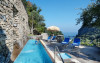 Piscina este cu apa de mare si este inconjurata de o terasa cu sezlonguri si umbrele de soare.