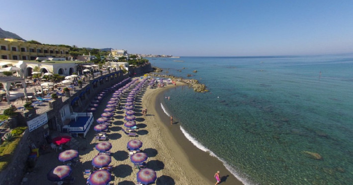 Privind in jur, pot fi descoperite numeroasele piscine in aer liber si plaja privata, care este deschisa intre orele 8:00 si 19:00. Aceasta este echipata cu umbrele de soare, si sezlonguri gratuite pe tot parcursul sezonului, cu exceptia celor din luna august - spatiul cu umbrele de soare si 2 sezlonguri costa 15 euro pe zi; prosoapele de plaja sunt incluse in tarif.