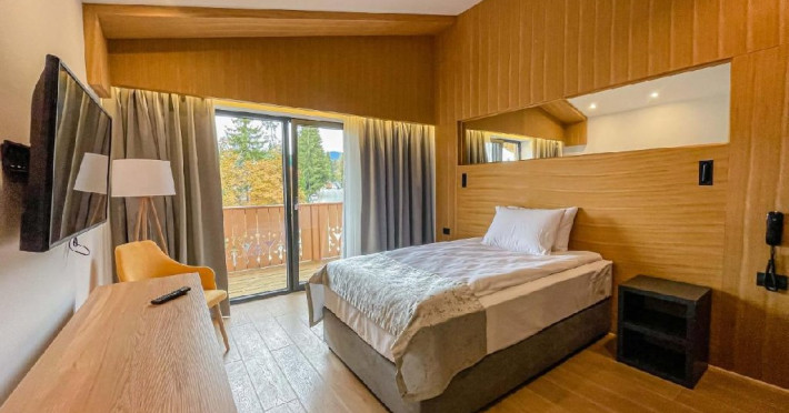 Camera Single are o suprafata de 14 mp, dispune de un pat matrimonial de 120x200 cm, incalzire in pardoseala, priveliste catre Masivul Postavaru si balcon, baie proprie cu cabina de dus.