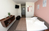 CAMERA DUBLA STANDARD- situata de la parter pana la etajul 7, dispune de balcon (dotat cu o masuta si 2 scaune). Dispune de un pat matrimonial de 160x200 cm pentru maxim doua persoane sau doua paturi separate de o persoana de 90/190, la cerere si contra cost se mai poate adauga inca un pat suplimentar (pliant) pentru copii. Baia este reconditionata partial. Suprafata totala a camerei dubla standard este de aproximativ 17 m inclusiv holul si baia.