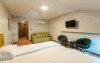 Camerele triple dispun de paturi twin, potrivite pentru un cuplu sau 3 prieteni si o canapea extensibila. Includ un dulap spatios cu rafturi, zona umerase si baie proprie. De la balconul camerei turistii se pot bucura de peisajul ce inconjoara ocrotitor locatia. Suprafata camerei 30 mp, capacitate 3 persoane. Sunt 2 triple cu balcon si 4 la mansarda.