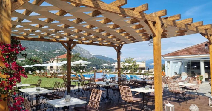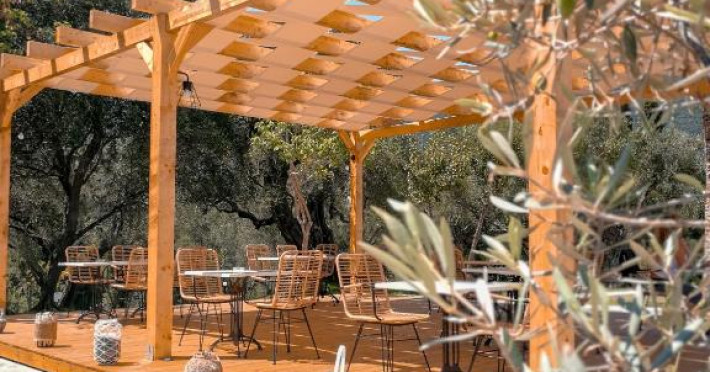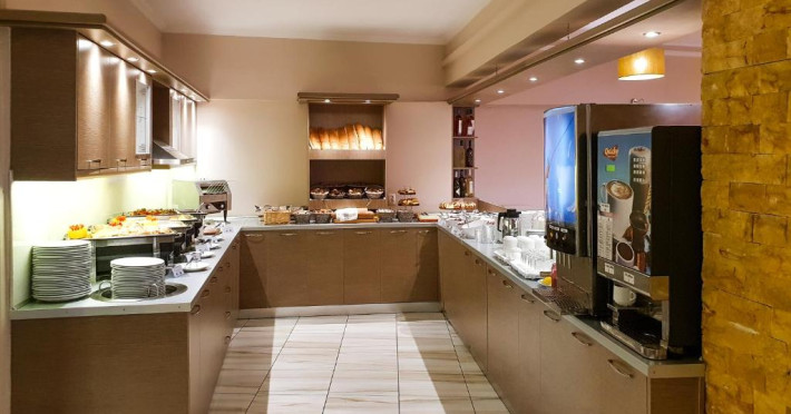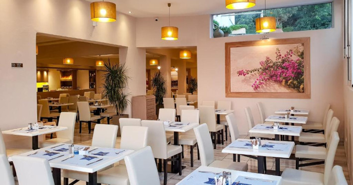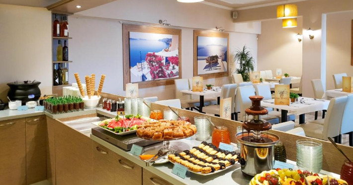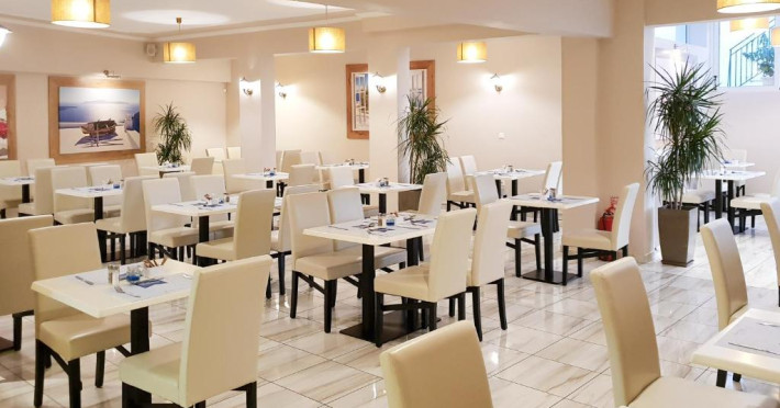 Oaspeții pot savura un mic dejun grecesc certificat la restaurantul Thalassa. Barul Ammos este situat langă piscină. Portul se află la doar 5 minute de mers pe jos și oferă o varietate de baruri și restaurante.