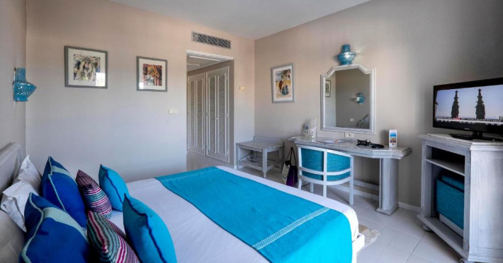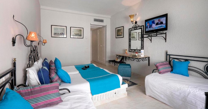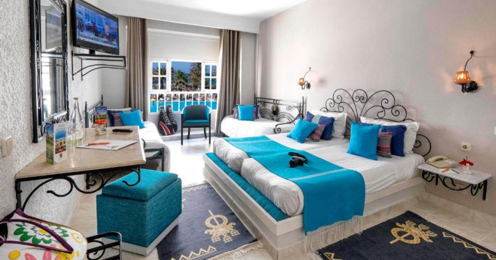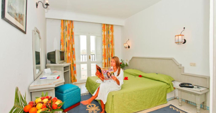 Camerele confortabile de la Houda Golf Beach & Aquapark au pardoseală de gresie/ marmură, aer condiționat, Tv cu canale prin satelit și seif. Oaspeții au la dispoziție serviciul de room service pentru a servi masa sau diverse băuturi. Oaspeții au acces gratuit la serviciul Wi-fi în camere. În camere există baie cu cadă și duș ce are în dotare articole de toaletă gratuite. Camerele au balcon cu vedere la mare sau la grădină. Curățenia in cameră se face zilnic. Proprietatea oferă camere pentru familie cu o suprafață mai mare și un număr mai mare de paturi față de cele standard.
