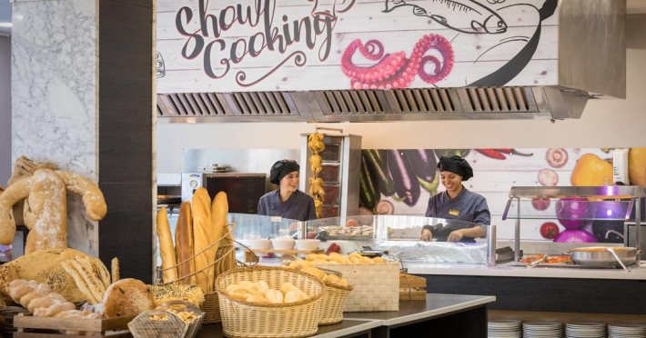 La Htop Olympic oaspeții au la dispoziție un restaurant care servește mâncare în stil bufet. Bucătăria mediteraneană de la Htop Olympic propune preparate delicioase care satisfac gusturi diverse. Masa poate fi servită atât în interior, cît si în aer liber, pe terasă, în funcție de vreme. 2 baruri, dintre care unul la piscină, sunt disponibile cu o ofertă variată de băuturi răcoritoare și alcoolice. În cadrul proprietății există și un snack bar care servește băuturi și gustări. Pentru cei cu anumite nevoi de nutriție, Htop Olympic oferă meniuri pentru diete speciale.
