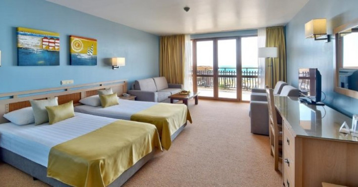 10 junior suites- au 55m2, au un living room cu sofa, sunt situate in partea centrala a hotelului, au vedere partiala la mare, au balcon si de pot caza 2ad+2copii sau 3 ad+1 copil