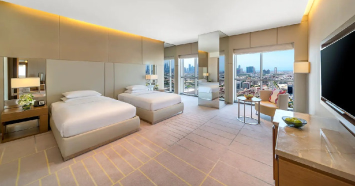 463 guestrooms including 95 suites ranging in size from 38 to 702 square metres. 232 Standard rooms, 60 Deluxe rooms, 76 Regency Club rooms, 20 Junior suites, 35 Regency suites, 24 Regency Executive suites, 11 Emiri suites, 4 Prince suites, 1 Royal suite and 405 fully-functional residential units