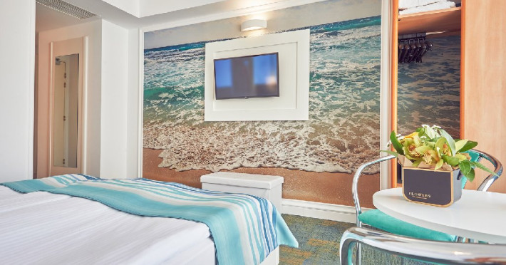 Camerele Family deluxe cu vedere la mare: au o suprafata de 29 mp si sunt dotate cu pat matrimonial, canapea extensibila, baie proprie cu dus, Wifi gratuit, seif in camera, minibar, aparat ceai/cafea. Aceste camere pot gazdui pana la 3 oaspeti.