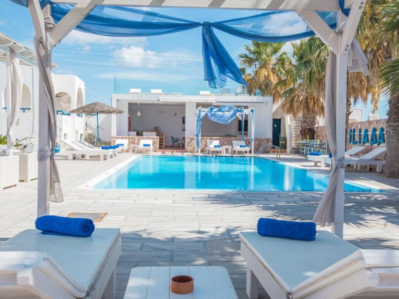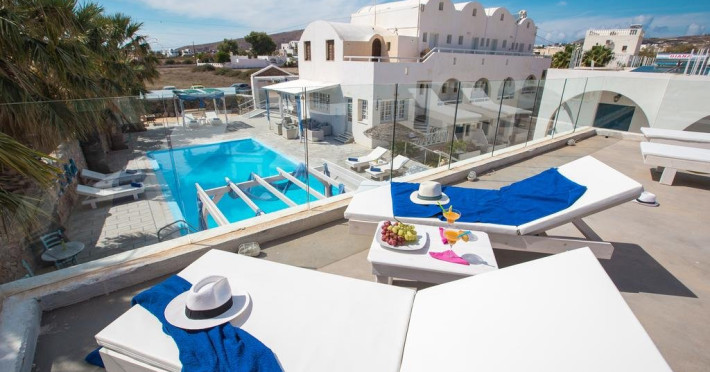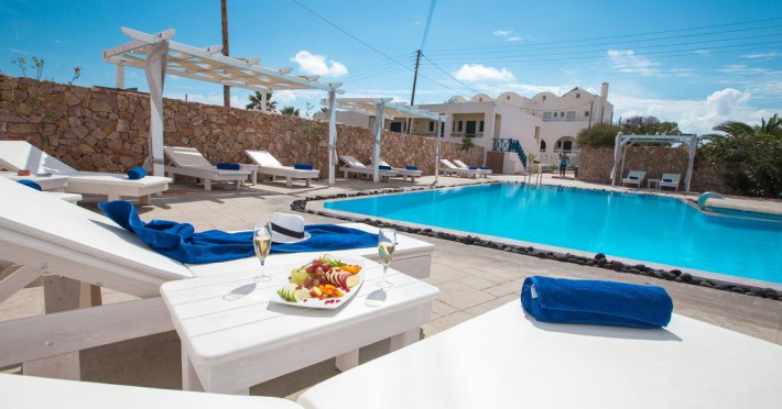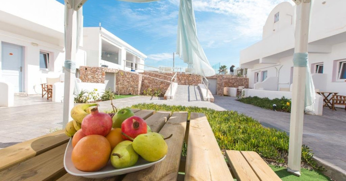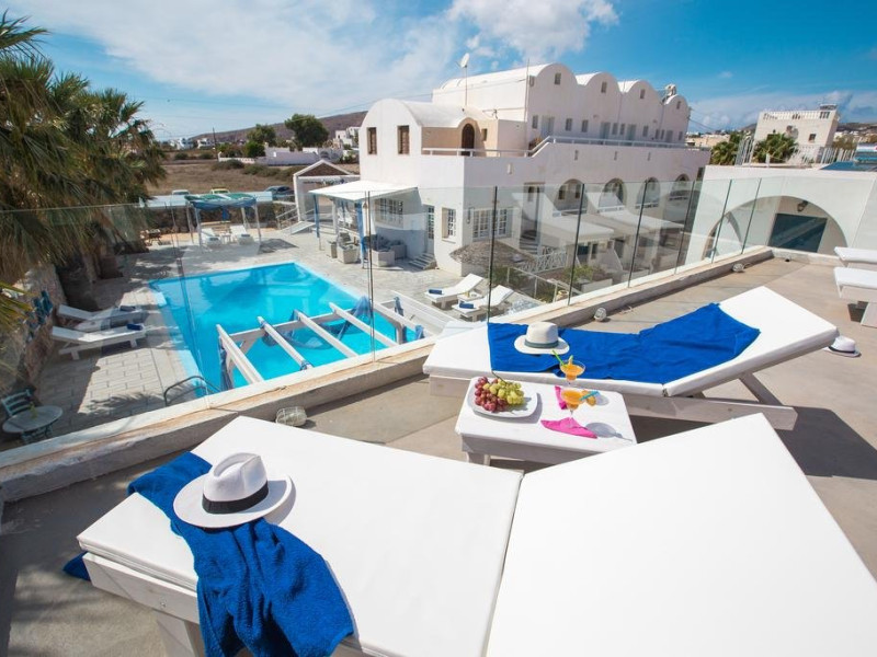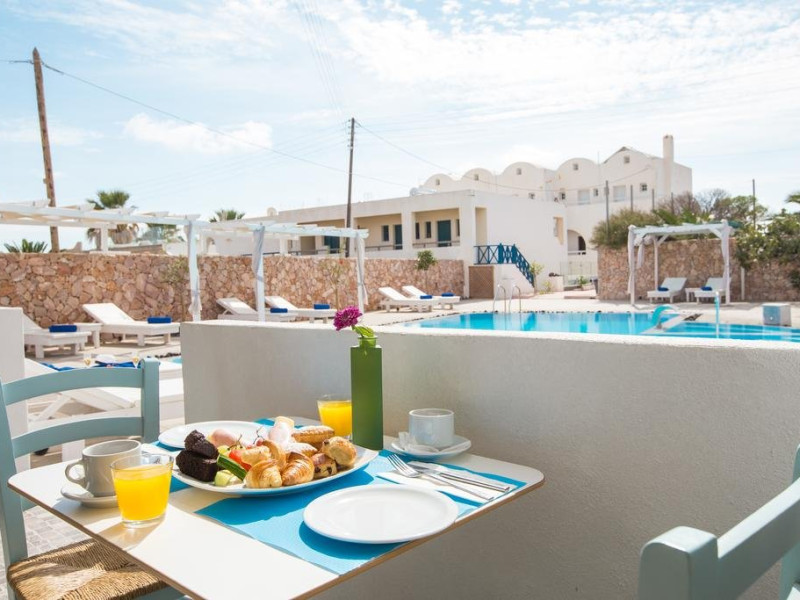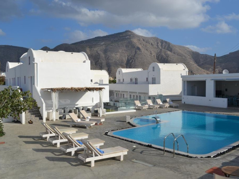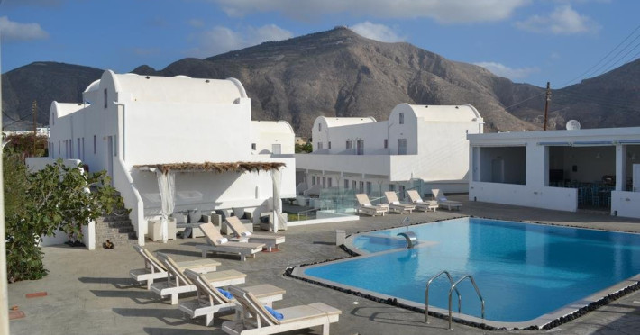 Descriere: hotelul are doua corpuri: Iliada si Odysseas construite in stilul traditional santorinez si ofera o ambianta placuta, cu camera spatioase, utilate corescpunzator, fiind alegerea ideala pentru familii si cupluri de toate varstele.Localizare: hotelul este situat la 2 minute de mers de plaja cu nisip negru din Perivolos (250 m), aproape de restaurant, mini market si statia de autobuz. Hotelul se afla la 800 m de centrul statiunii Perissa, la 10 km de Fira si la 10 km de aeroport.