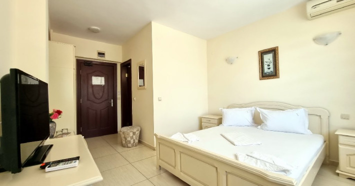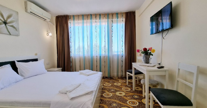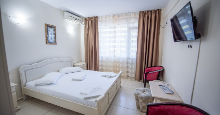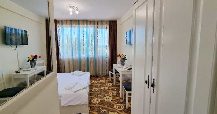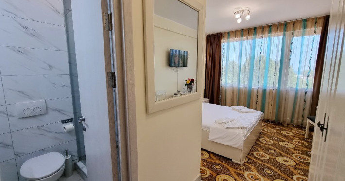 Camere: Hotelul dispune de camere duble cu grup sanitar si cabina de dus,usi noi de acces in camere si mobilier nou deosebit, saltele inlocuite in 2021, tamplarie PVC, TV cu cablu, frigider, aer conditionat.