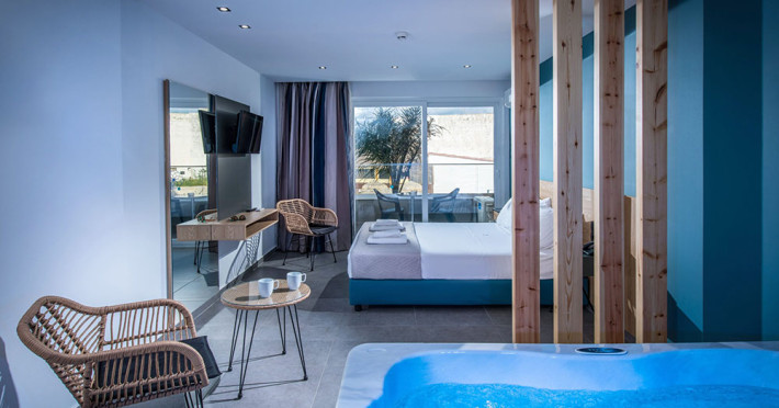Infinity Blue Boutique Hotel este un hotel de 4 stele situat în Hersonissos, care este una dintre cele mai faimoase destinații din Creta, La câţiva paşi de hotel se află strada principală plină de viaţă, care oferă o serie de restaurante şi baruri. Un supermarket este la 10 metri, iar autogara se găsește la 50 de metri. Aeroportul Nikos Kazantzakis se află la 20 km de.Localizare
