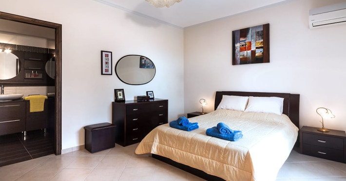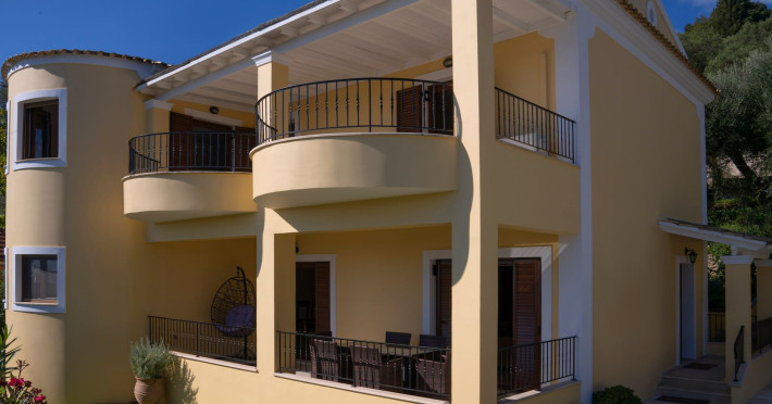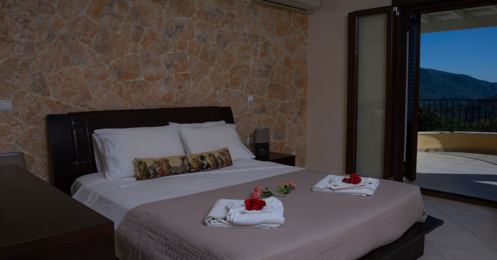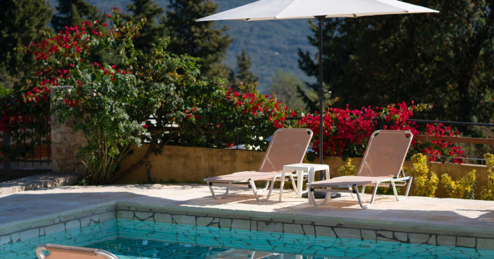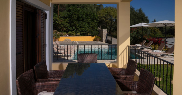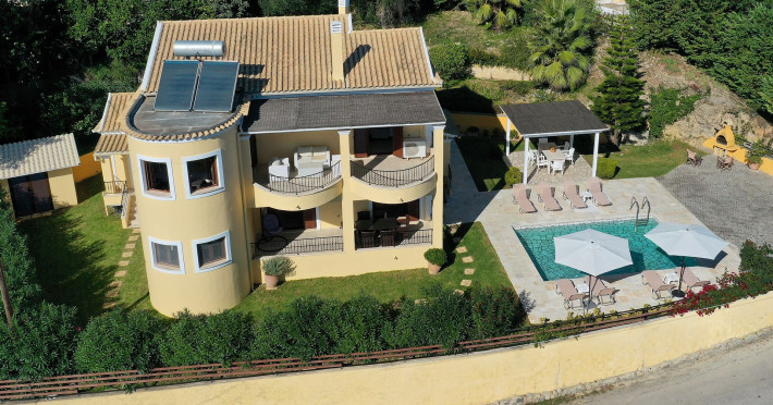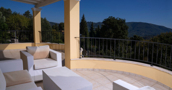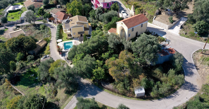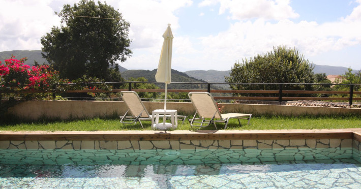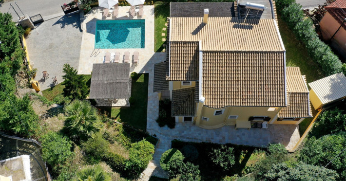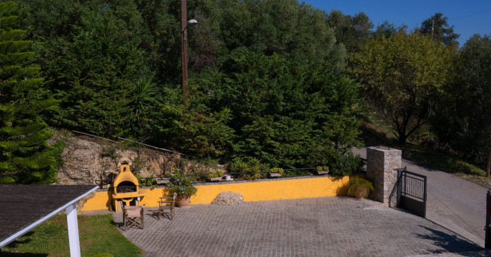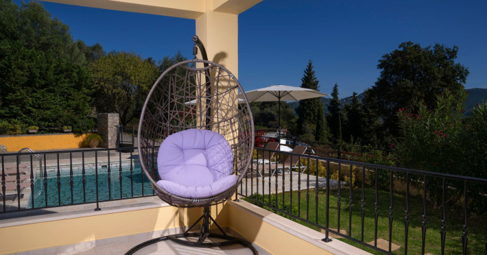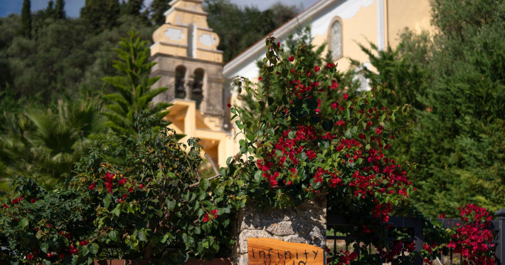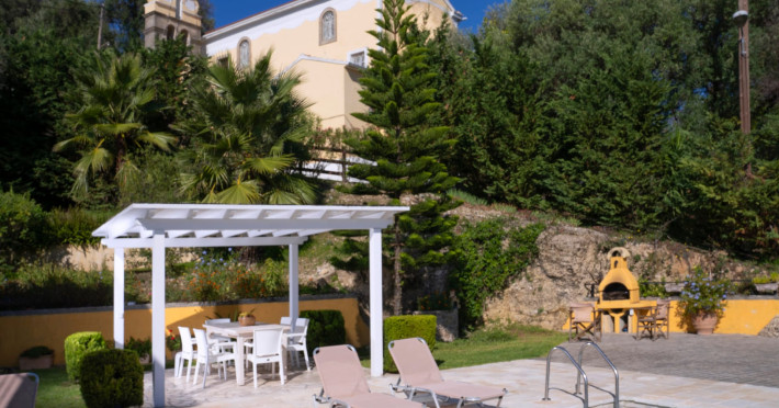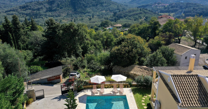 Infinity Villa is situated right in the middle of the island and close to its West side. Its strategic location makes it ideal for travelers keen to explore all the “must visit” attractions and beaches of the largest and most diverse among the Ionian Islands. Built in the heart of the Traditional village of Kato Pavliana, right below the village’s church and campanile, it is completely eye-protected of the main road, thus providing relaxation and tranquility. It is surrounded by unspoiled nature and its revitalizing sounds and offers uninterrupted 180 views to the open countryside, clear Corfiot sky and the vast olive groves onto Paramonas. The renowned sandy beach of Agios Gordios with its crystal clear waters and stunning sunset is at 5 km (9 minute drive through untouched green scenery). The family resort beach of Paramonas is at 5 km (10 minute drive to the other side). The villa is built in respect to the traditional Corfiot Architectural style and features extensive grounds both indoors and outdoors. It can accommodate up to 8 guests with 4 bedrooms and 3 bathrooms, and is an idyllic place for a relaxing holiday for all the family or for groups of friends keen to leave everything behind for a while. The villa is furnished with dark wooden furniture and minimal, yet elegant decoration. Features very spacious rooms and indoor spaces, huge open plan kitchen (fully equipped with brand new electrical appliances and anything you need for preparation of meals) with dining area that can easily sit 10 guests, large living room with adobe fireplace, large verandas (furnished, with outdoor dining area) that open out to the countryside, large and brand new bathrooms and a small gym (for those who wish to leave everything behind except their daily work-out!). The interior marble stairs lead to the upper floor where there are 3 bedrooms and another 2 bathrooms that open to a share shaded-pergola veranda with stunning views to the countryside and the surroundings. The garden is well maintained and has a small dip pool and sun loungers in order for the tenants to luxuriate in their beautiful surroundings. There is a gazebo and another outdoor sitting/dining area behind the dip pool and a small organic vegetable farm, which the owner grows with great passion. Whatever grows in the garden is for its residents, so feel free to pick anything that suits your daily menu and offer yourselves the experience to taste vegetables as they should taste for a while! Parking for 2 car seats is also available within the property premises. Although quiet and peaceful there are many activities, attractions and places of interest within a few minutes’ drive, so a car is essential for those who want to have a complete taste of Corfu!BedroomsA twin bedroom downstairs (which is also used as the gym) with a small bathroom right outside. All main bedrooms are located in the upper floor. The marbles staircase leads to the upper floor where there are 3 bedrooms. The Master bedroom has a queen size matrimonial bed and en suite bathroom both with shower cabin and a Jacuzzi bathtub and 2 water basins. Another 2 bedrooms (matrimonial beds) downstairs are locate in the same floor, which share another bathroom (with bath tub). Both the master bedroom and one double open to a large, furnished shaded-pergola veranda with stunning views to the open countryside and vast olive groves. Minimal modern furniture and utilities, together with ample space and bright sunlight offer a relaxing decoration and make you want to stay in bed! One of the bedrooms has 2 windows that offer 180 stitch view from inside.Bathrooms1 bathroom downstairs, with a washing machine which is essential if one stays long, and another 2 bathrooms in the upper floor. One of them is with bath tub share between 2 double bedrooms. The other one is in the Master bedroom (en suite) and features 2 water basins, a shower cabin and a Jacuzzi bath tub.KitchenLarge, brand new, open plan fully equipped kitchen with a large dining table and enough space to sit 10 guests. Oven, large fridge/freezer, dish washer, stove, electric kettle, toaster, kitchenware & kitchen utensils, pans, kettle and anything one may need in order to prepare meals and enjoy the flavors of the local products!Living RoomThe main entrance in the ground floor opens to a large living room/dining area with a blend of modern and traditional furniture that create a relaxing environment. Large doors open onto the ground floor veranda with access to the garden and outdoor dining facilities for you to enjoy breakfast and light meals. Living rooms is air conditioned. There is also a small bathroom in the ground floor and a large room which is used as the gym when parties of residents consist of up to 6 guests. It can be used as an extra bedroom though; as it can accommodate 2 guests in single beds (most guests use it as child bedroom).Outdoor spaceLarge veranda with sitting and outdoor dining furniture. A gazebo for relaxing afternoon cocktails or tea. Built-in BBQ facilities available for a real countryside outdoor dining experience. A dip pool (small swimming pool) and sun loungers also available in order to enjoy the endless interaction of light and nature. Well maintained gardens that offer beautiful surroundings & privacy and parking space for 2 car seats. Your private (pick-your-own), small organic farm, for a real taste of Corfiot local products.Cleaning/Towels/Linen/Maid service:Maid service provided twice a week (additional days on request). Towels are also being changed twice weekly and bed linen once a week unless otherwise requested. Cooking service on daily basis (variety of local and Mediterranean cuisine) can be arranged on request.Property Facilities & Services• Self Catering Countryside Villa – sleeps 8 guests• Ground floor/ Living room, Kitchen, dining area, open terrace, bathroom (with shower)• Upper floor/ 3 bedrooms (1 en suite), 2 bathrooms (with bathtub), large furnished terr
