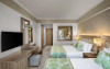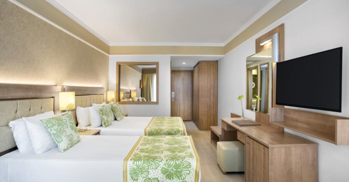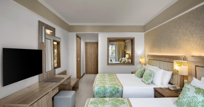 Hotelul are un numar total de 315 camere repartizate in trei cladiri: camere standard (24mp, un dormitor cu pat matrimonial + un pat single, o baie, max.2+2pax), camere Family (35mp, doua dormitoare cu usa intre ele, o baie, max4pax), camere Family suit (47mp, doua dormitoare cu usa intre ele, o mica canapea, o baie, max.4pax). Toate camerele au balcon, baie privata cu cabina de dus sau cada, uscator de par, aer conditionat centralizat cu program in functie de conditiile meteo, linie telefonica directa, mocheta, mini bar (apa, bauturi racoritoare realimentat zilnic), seif, TV prin satelit.