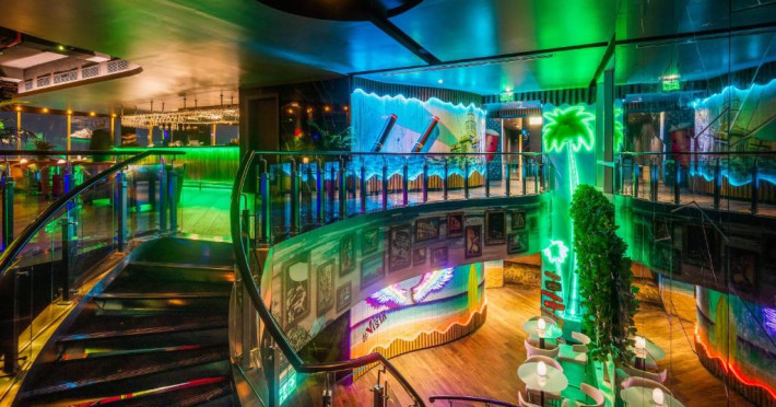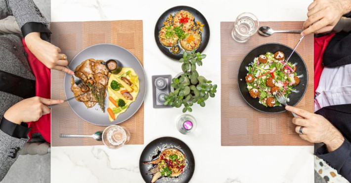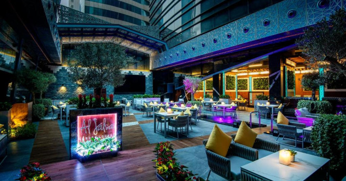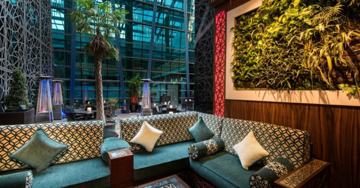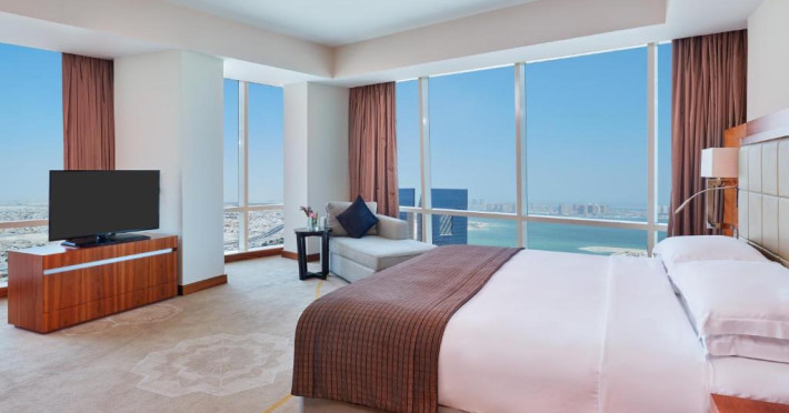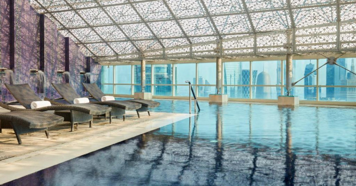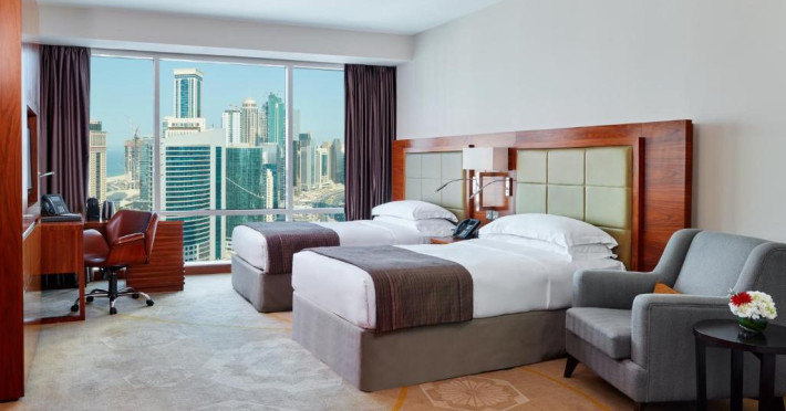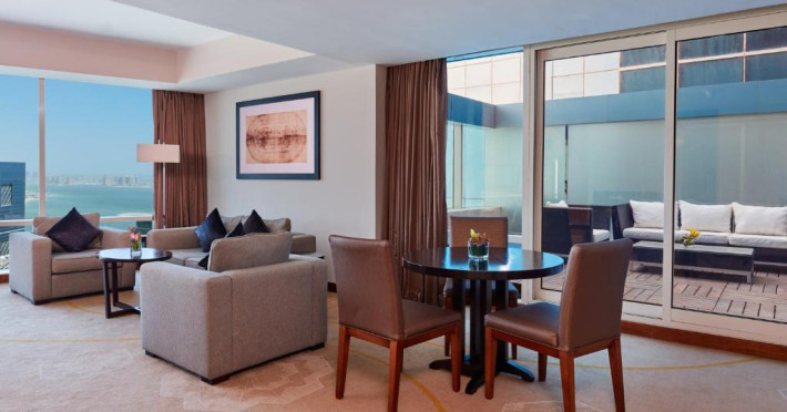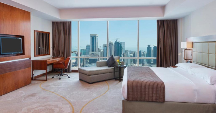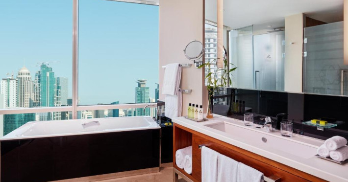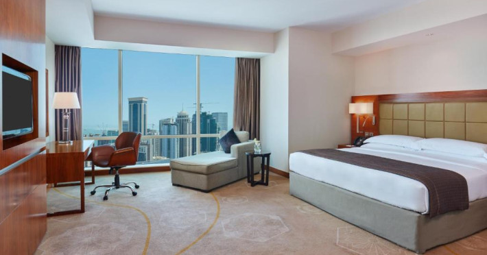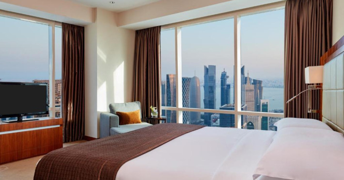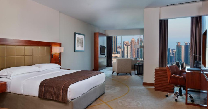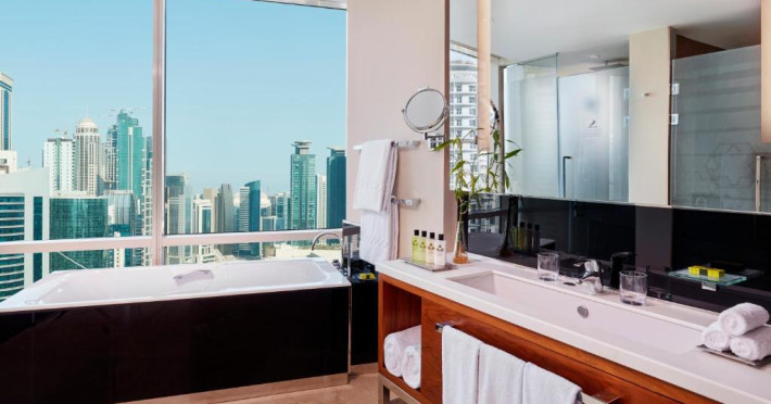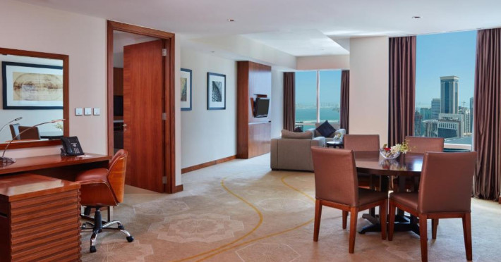 Oaspeții au la dispoziție 4 restaurante care servesc preparate din bucătăria internațională și 3 lounge baruri, printre care cel mai sus lounge din Doha, cu vedere uimitoare la orizontul orașului.
