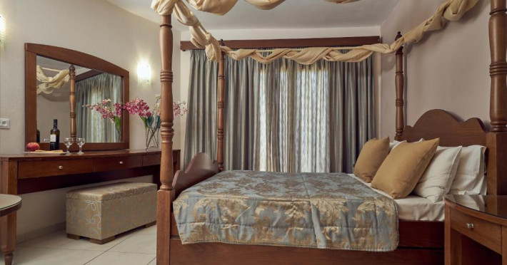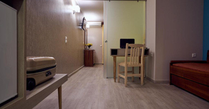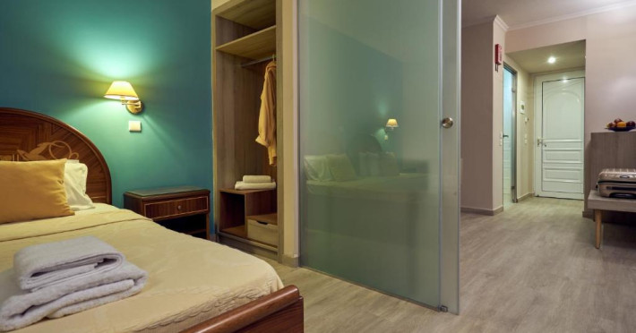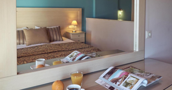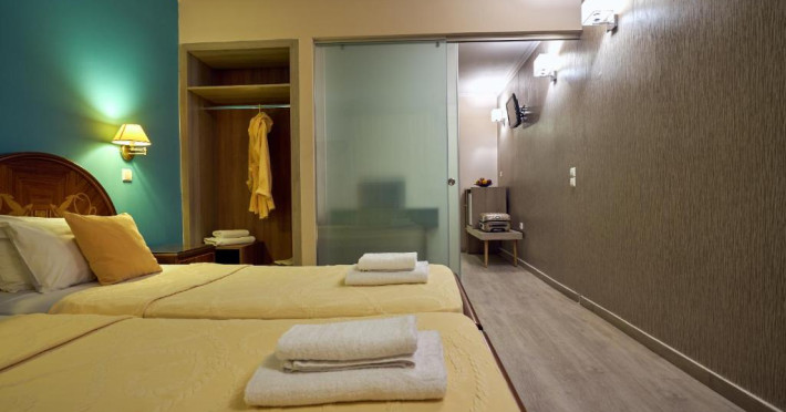 Sunt disponibile 52 camere. Fiecare cameră dispune de minibar și mașină pentru preparare cafea sau ceai. În camere există baie cu duș prevăzută cu foehn. Camerele au balcon cu masă și scaune unde pot fi petrecute momente de relaxare. Camerele luminoase de la Ionion Blue sunt dotate cu aer condiționat și Tv cu canale prin satelit. Oaspeții au acces gratuit la serviciul Wi-fi în camere. Curățenia in cameră se face zilnic. Fiecare unitate de cazare are frigider. Proprietatea oferă camere pentru familie cu o suprafață mai mare și un număr mai mare de paturi față de cele standard. Se pot rezerva de asemenea camere pentru nefumători.