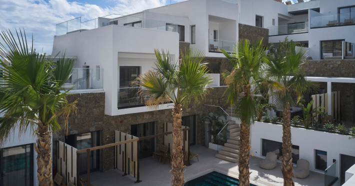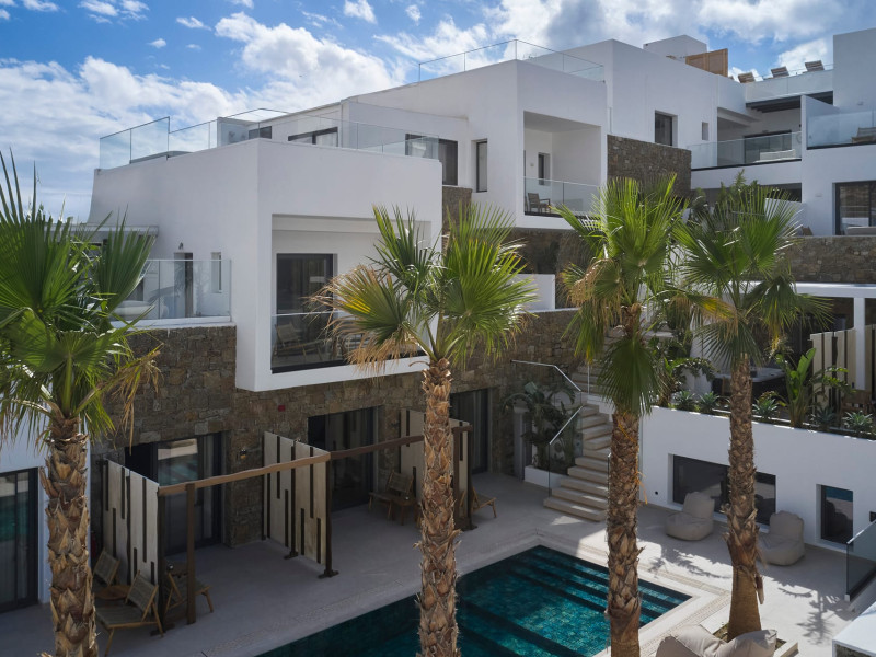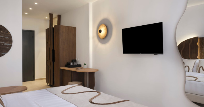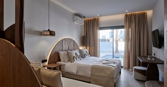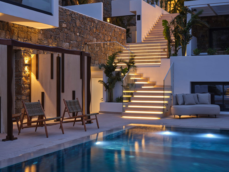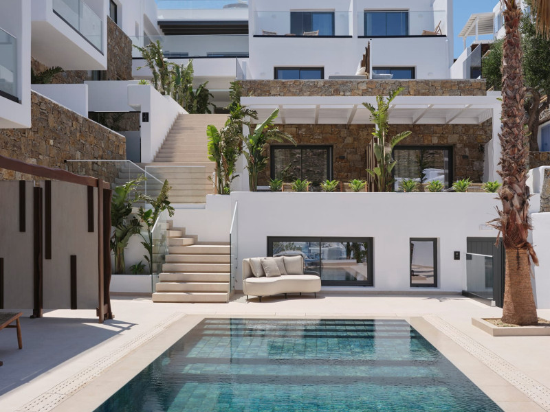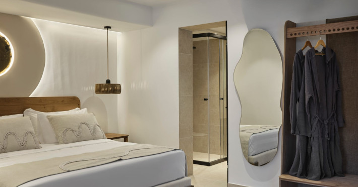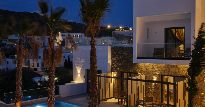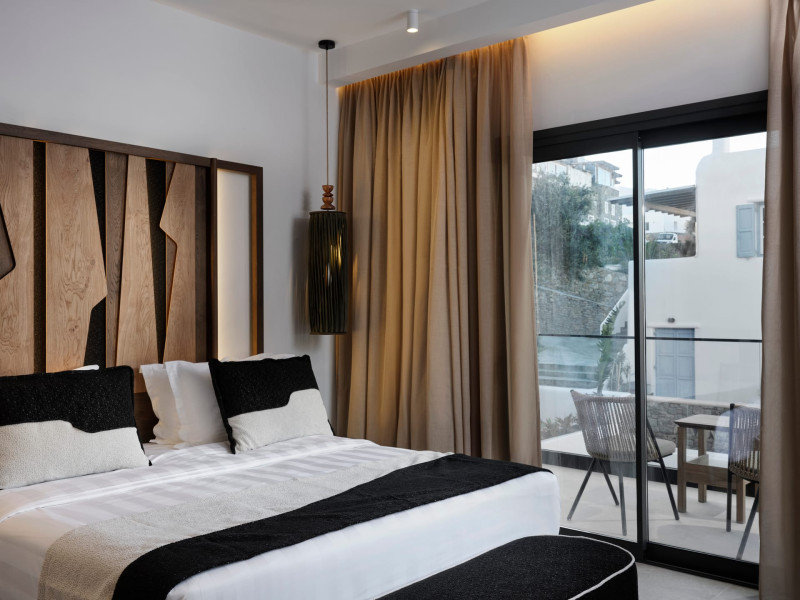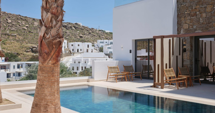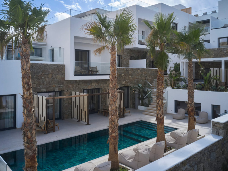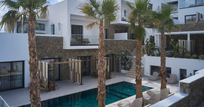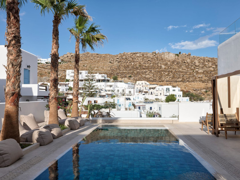 Iria Blue Mykonos is a stylish 4-star boutique hotel in Platis Gialos, known for its modern elegance and warm Cycladic atmosphere. Key FeaturesPrime Location: It is located within a 5-minute walk of the popular Platis Gialos and Psarou beaches.Modern Design: The hotel features "futuristic" handcrafted furniture and a blend of natural materials like wood and stone.Upscale Amenities:Two swimming pools: a heated shared pool and a rooftop pool with panoramic views.On-site dining at Il Mare restaurant, serving Greek and Mediterranean cuisine.Wellness facilities including a fitness center and spa services like deep-tissue massages.Accommodations: Rooms, suites and bigger apartments are elegantly decorated; some include a private heated pool or an outdoor jacuzzi.Service: Guests frequently praise the attentive 24-hour concierge service and the high standard of cleanliness. The hotel is approximately a 5-minute drive from Mykonos Town (Chora) and the famous windmills.Iria Blue Mykonos is a stylish 4-star boutique hotel in Platis Gialos, known for its modern elegance and warm Cycladic atmosphere. Key FeaturesPrime Location: It is located within a 5-minute walk of the popular Platis Gialos and Psarou beaches.Modern Design: The hotel features "futuristic" handcrafted furniture and a blend of natural materials like wood and stone.Upscale Amenities:Two swimming pools: a heated shared pool and a rooftop pool with panoramic views.On-site dining at Il Mare restaurant, serving Greek and Mediterranean cuisine.Wellness facilities including a fitness center and spa services like deep-tissue massages.Accommodations: Rooms, suites and bigger apartments are elegantly decorated; some include a private heated pool or an outdoor jacuzzi.Service: Guests frequently praise the attentive 24-hour concierge service and the high standard of cleanliness. The hotel is approximately a 5-minute drive from Mykonos Town (Chora) and the famous windmills.
