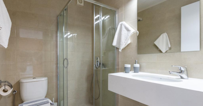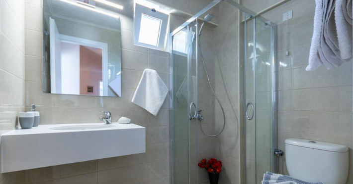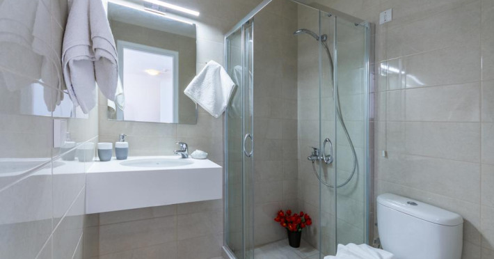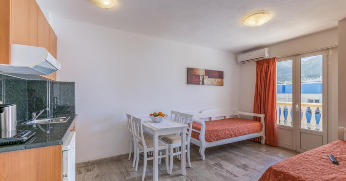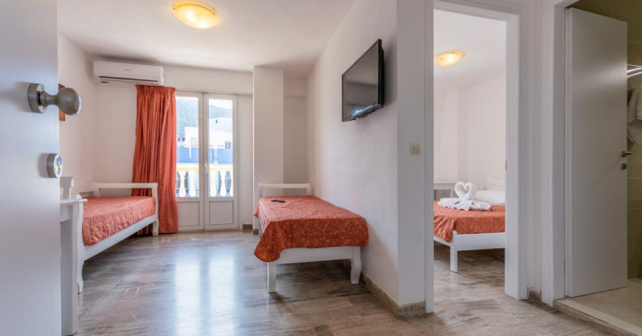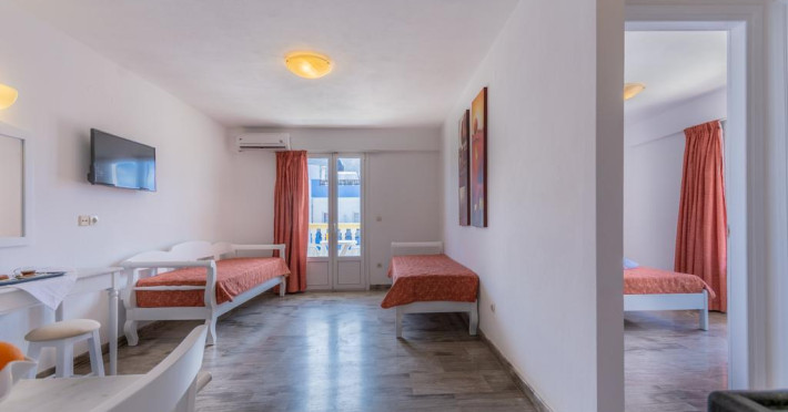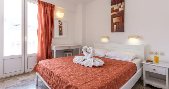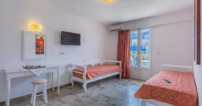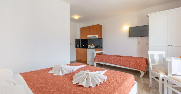 În camere există baie cu cadă sau duș prevăzută cu foehn. Unele camere au balcon cu vedere la mare sau la piscină. Camerele confortabile de la Irini Apartments au pardoseală de gresie/ marmură, aer condiționat, Tv cu canale prin satelit și seif. Fiecare cameră dispune de mașină pentru preparare cafea sau ceai și fierbător Toate camerele spațioase de la Irini Apartments au zonă de relaxare cu canapea, ceea ce oferă un plus de confort. Fiecare unitate de cazare include o chicinetă utilată cu frigider, plită de gătit și ustensile de bucătărie. Proprietatea oferă camere pentru familie cu o suprafață mai mare și un număr mai mare de paturi față de cele standard. Se pot rezerva de asemenea camere pentru nefumători.