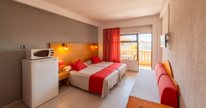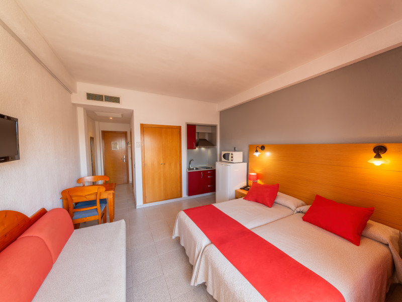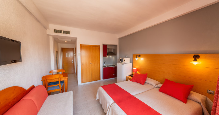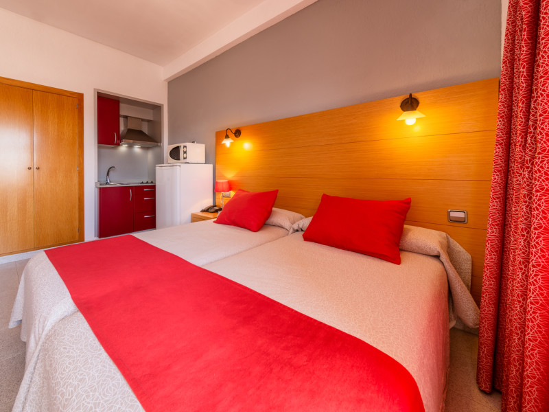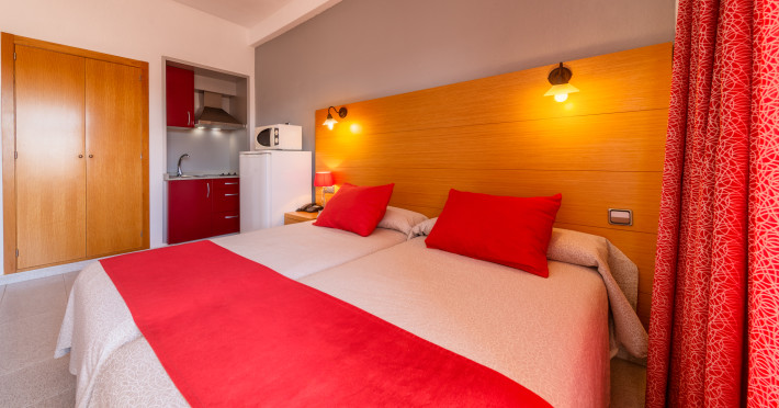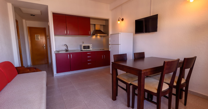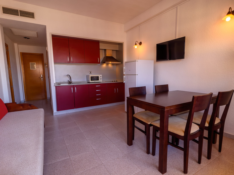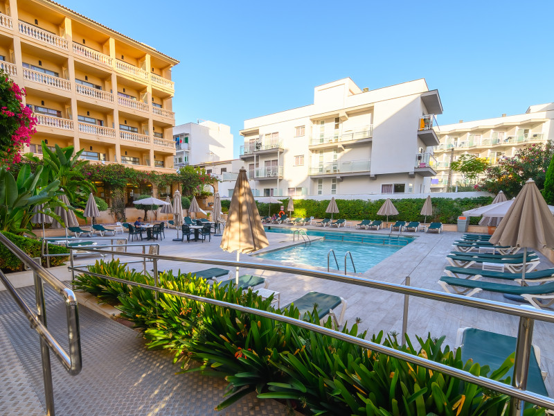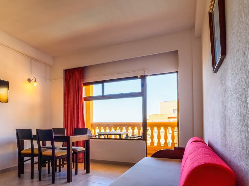 About 300 m from a public sandy beach is located the aparthotel Apartamentos Isla del Sol. The nearest restaurants and bars can be found within 200 m. The old town is around 5 km away. The nearest shops you can reach within around 1 km, a supermarket is just a few metres away from the hotel. There is a shuttle between the hotel and the airport (for a fee). Nearby there is a disco which offers entertainment in high season. The beach is awarded a blue flag. Here, there are beach towels for a fee as well as cushions and sun umbrellas available. Near the beach there is a promenade where you can go for a stroll. The air-conditioned, GPS-verified hotel has a 24h reception, a lobby bar, Wi-Fi, internet access, 2 lifts, showers and changing rooms as well as a TV lounge with satellite TV. In the outdoor area you will find a garden as well as a supervised pool, where you can rent pool towels for a fee and sun loungers and sun umbrellas are available for free. There is also an integrated children's pool with a non-swimming area. Furthermore, outside you can find a sun terrace. You can store your valuables in the safe, and your luggage in the hotel`s storage room. In addition, the hotel Apartamentos Isla del Sol is video-monitored 24h a day. For very young guests, kid`s chairs and cots can be provided. There is also an ironing service. The energy supply is 220 Volts. If you want to explore the holiday region, you can use the car rental service close to the hotel. At the hotel reception, tickets are offered for excursions in the area. In your hotel, a lot of focus is placed on sustainability. This includes the hotel`s own recycling bins, the provision of soap, shampoo and lotion dispensers and organic food. American Express, Euro/Master Card, JCB, Visa and EC cards are accepted as means of payment. Due to its barrier-free facilities , such as a sliding door in the entrance area, an automatic hotel door, barrier-free entrances, wheelchair accessible rooms and a wheelchair accessible lift, the hotel is also suitable for wheelchair users. Catering Enjoy your lunch à la carte. For the meals, there are a restaurant with terrace and a bar, the cafeteria as well as the pool bar. The drinks menu of the hotel includes water, soft drinks, coffee and tea, beer and wine. Distances