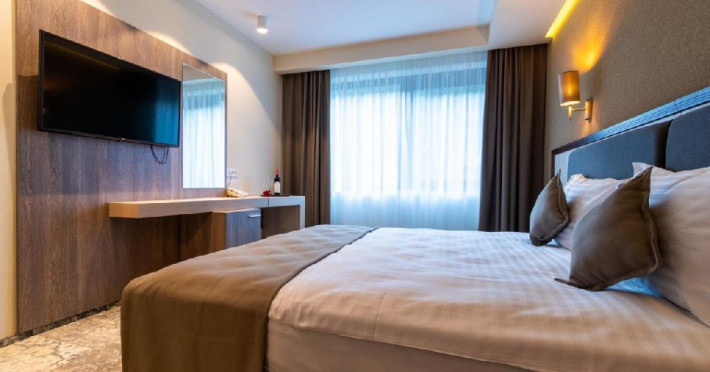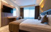 Junior Suite - Atmosfera apartamentelor este speciala, iar confortul este sporit de dimensiunea camerelor si a bailor, de utilarea perfecta a camerelor dar si de designul modern si cochet. Apartamentele sunt destinate pentru maxim 3 adulti sau 2 adulti si 2 copii cu varsta mai mica de 14 ani.