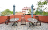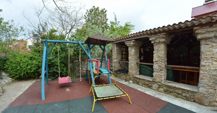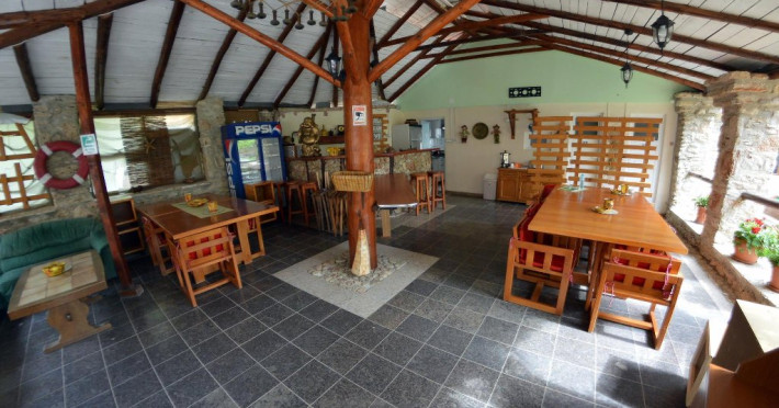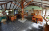 - terasa deschisa, din piatra si marmura, acoperita cu stuf, cu mese si canapele din lemn masiv pentru aproximativ 50 pers, unde se poate servi micul dejun in regim ,,bufet suedez (cafea, bauturi racoritoare, ceai etc.)