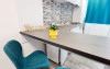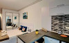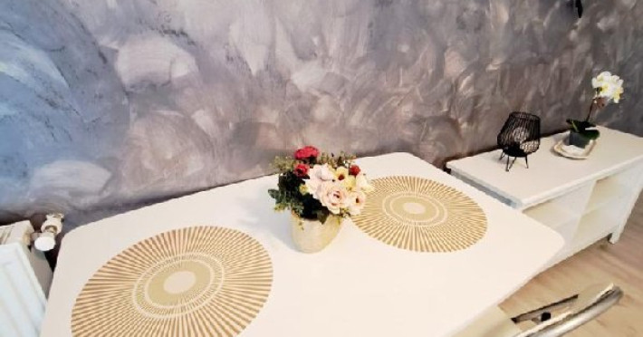 Camera de living este despartita de un perete decorativ fata de zona de pregatit si luat masa.