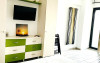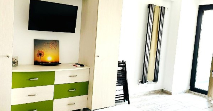 Camera de zi este dotata cu pat matrimonial 160 x 200, un extra pat pliabil de 1 persoana 80 x200, un dressing generos pentru haine, 2 comode in dreptul patului, o masa cu 2 scaune tip bar, suport uscator de rufe, fier si masa de calcat. In plus, Smart TV, cablu TV, WI-FI gratuit, AC, masina de spalat rufe.