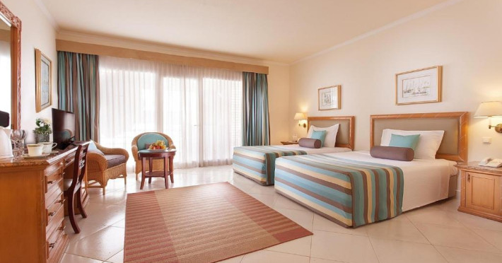 Sunt disponibile 418 camere. Camerele confortabile de la Jolie Ville Golf & Resort au pardoseală de gresie/ marmură, aer condiționat, Tv cu canale prin satelit și seif. Fiecare cameră dispune de un aparat pentru preparare cafea sau ceai, cană-fierbător și minibar. Oaspeții pot solicita serviciul de room service pentru a servi masa sau diverse băuturi. Oaspeții au acces gratuit la serviciul Wi-fi în camere. Camerele au balcon cu vedere la mare sau la piscină. În camere există baie cu cadă sau duș prevăzută cu foehn. Curățenia in cameră se face zilnic. Există camere care au zonă de relaxare cu canapea, ceea ce asigură un plus de confort și răsfăț. Proprietatea oferă camere pentru nefumători.