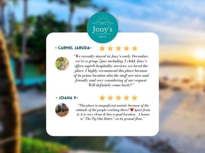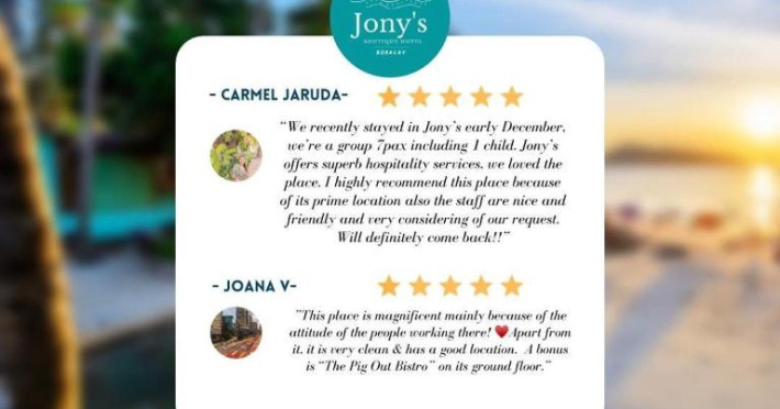 Hotelul Jony's Boutique este la 1,9 km de Willy's Rock și la 8 minute de mers pe jos de plaja Bulabog, iar portul Caticlan Jetty se află la 5 km.