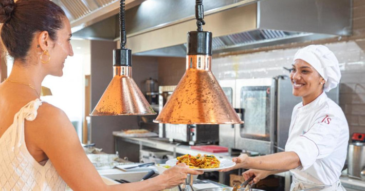 Restaurantul tip bufet de la JS Sol de Alcudia servește preparate din bucătăria regională și internațională. Oferă bucătărie deschisă și o cină tematică săptămanală. De asemenea, există un bar cu terasă la piscină cu muzică live in fiecare seară.