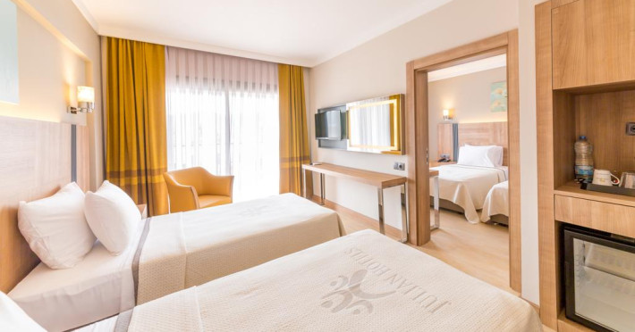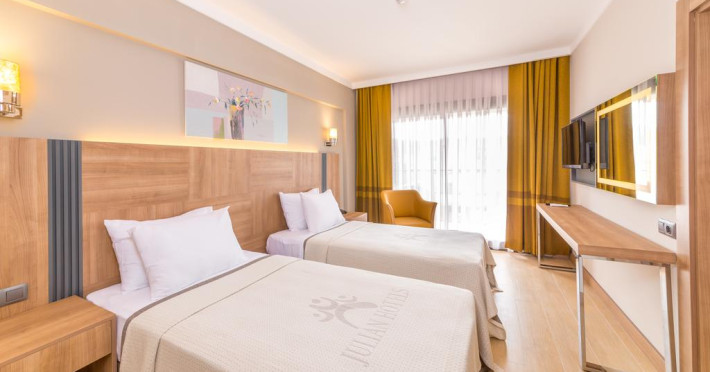 Camerele confortabile de la Julian Marmaris au pardoseală de gresie/ marmură, aer condiționat, Tv cu canale prin satelit și seif. În camere există baie cu cadă sau duș ce are în dotare foehn și articole de toaletă gratuite. Unele camere cu balcon cu vedere la oraș. Fiecare cameră dispune de minibar și cană pentru preparare apă caldă. Oaspeții au acces gratuit la serviciul Wi-fi în camere. Curățenia in cameră se face zilnic. Proprietatea oferă camere pentru nefumători.