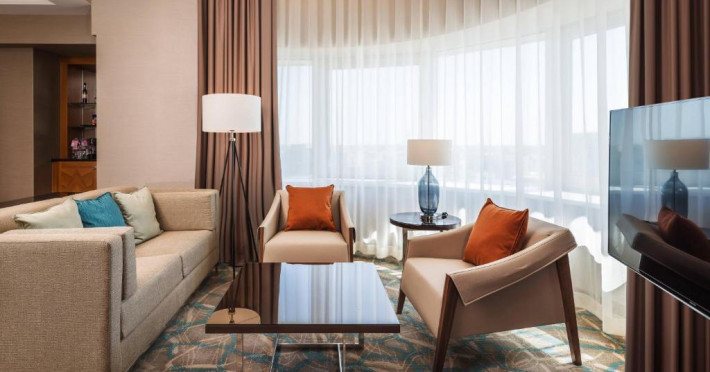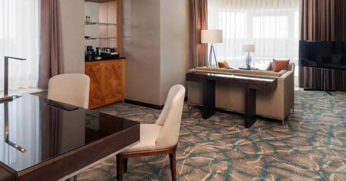 Hotelul Marriott Bucharest oferă confort si elegantă la cele mai inalte standarde europene, avand 402 camere Deluxe, 6 restaurante, un centru de conventii, un centru spa si club de sănătate, o galerie comercială si un cazinou Grand Casino. Accesul la internet WiFi este gratuit in zonele publice.