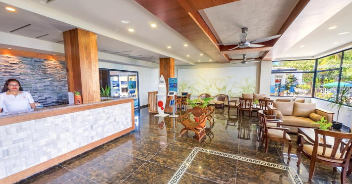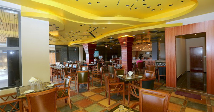 Restaurantul hotelului, situat vizavi de Bikini Beach, serveste preparate din bucătăriile locală si occidentală, cu vedere la laguna albastră.