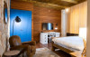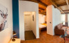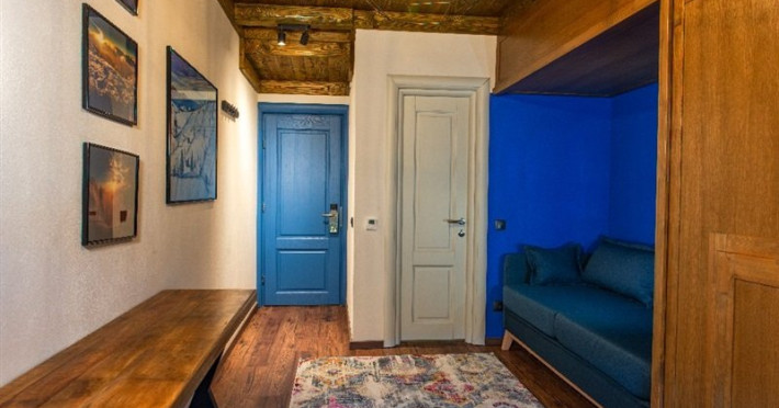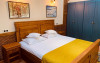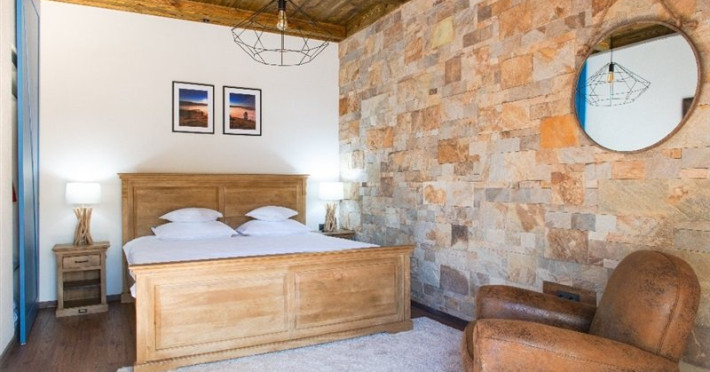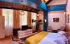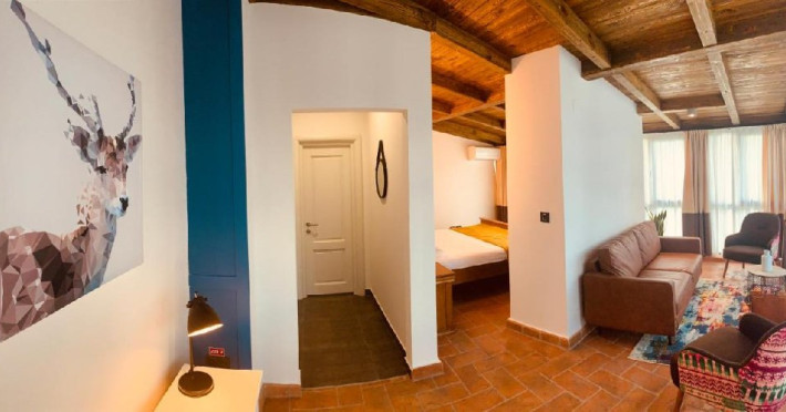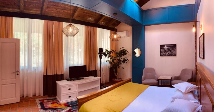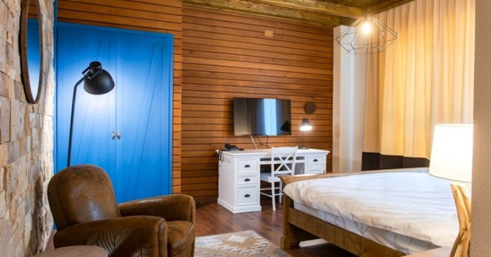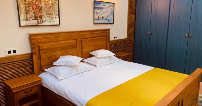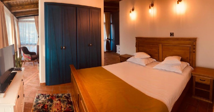 Camera dubla superioara: Camera cu suprafata de 35 mp, cu balcon, pentru doi adulti si un copil, dispusa pe doua niveluri, cu pat dublu mare in dormitorul aflat la nivelul superior si canapea la nivelul inferior.